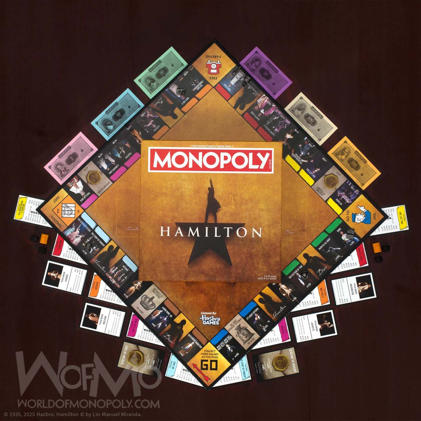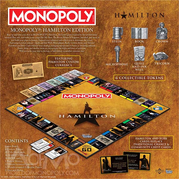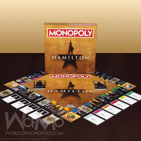 Celebrating 10 years on Broadway, the new game brings the magic of the stage to the tabletop. With harmonious twists on classic MONOPOLY components, fans will explore the exciting world of Hamilton as they buy, sell, and trade familiar songs from the show as they make their way to Broadway glory. Collect rent and negotiate trades, but beware—history has its eyes on you!