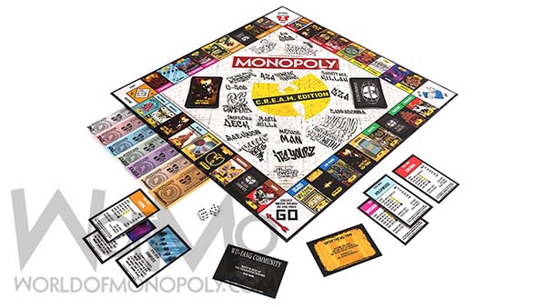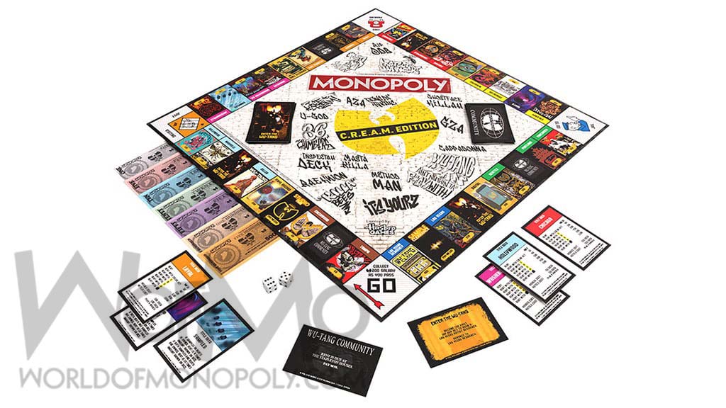 Features: Custom Wu-Tang Game Board, 3 Exclusive Wu Monopoly Tokens: the Boot, Sword, and Vinyl limited to the first 500 orders, 28 Title Deed Cards, 16 Enter the Wu Tang Cards, 16 Wu Tang Community Cards 32 Houses renamed Gold Singles, 12 Hotels renamed Platinum Singles, Money, Dice, Rules, Stunning Poster Art From Wu-Tang’s Epic Tour Stops.