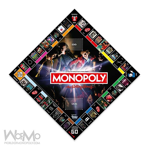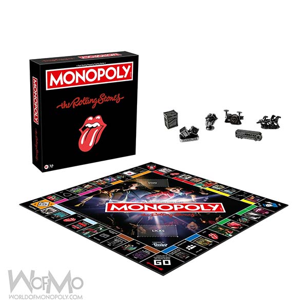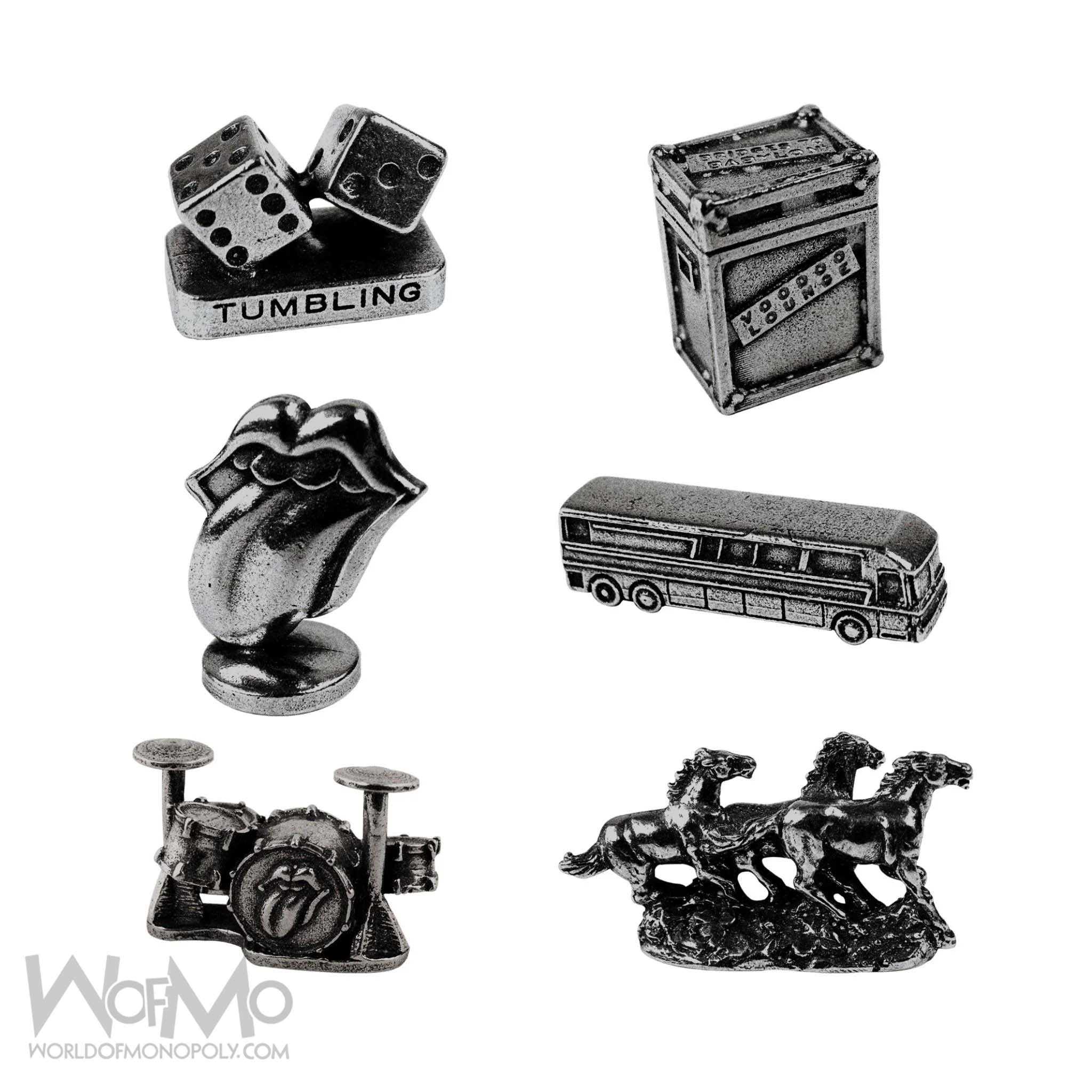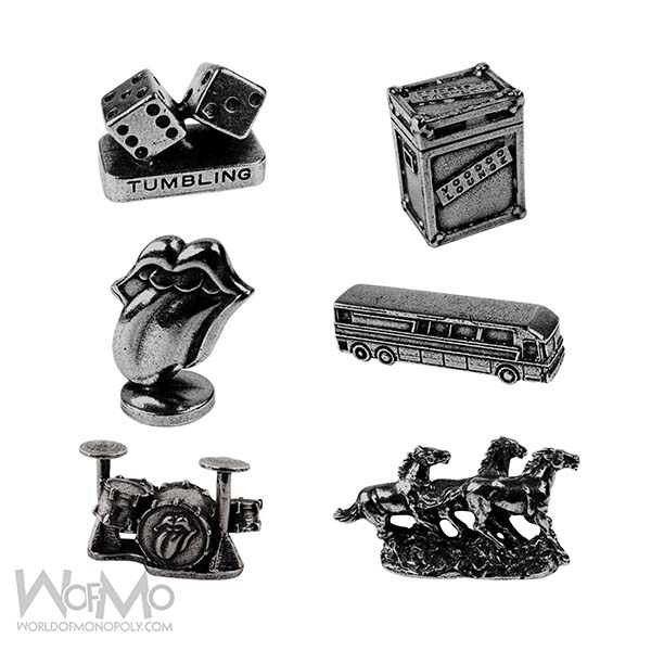 Tour the board with iconic pieces including the Tour Bus, Road Case, Tumbling Dice, Wild Horses, Drum Set, and Licks Logo.