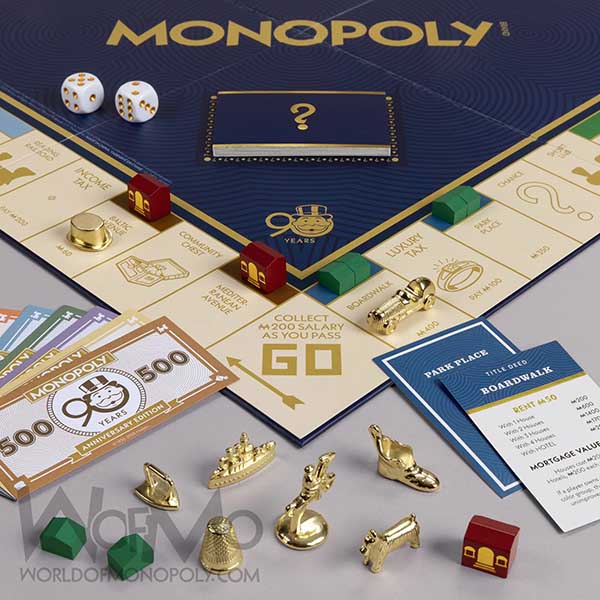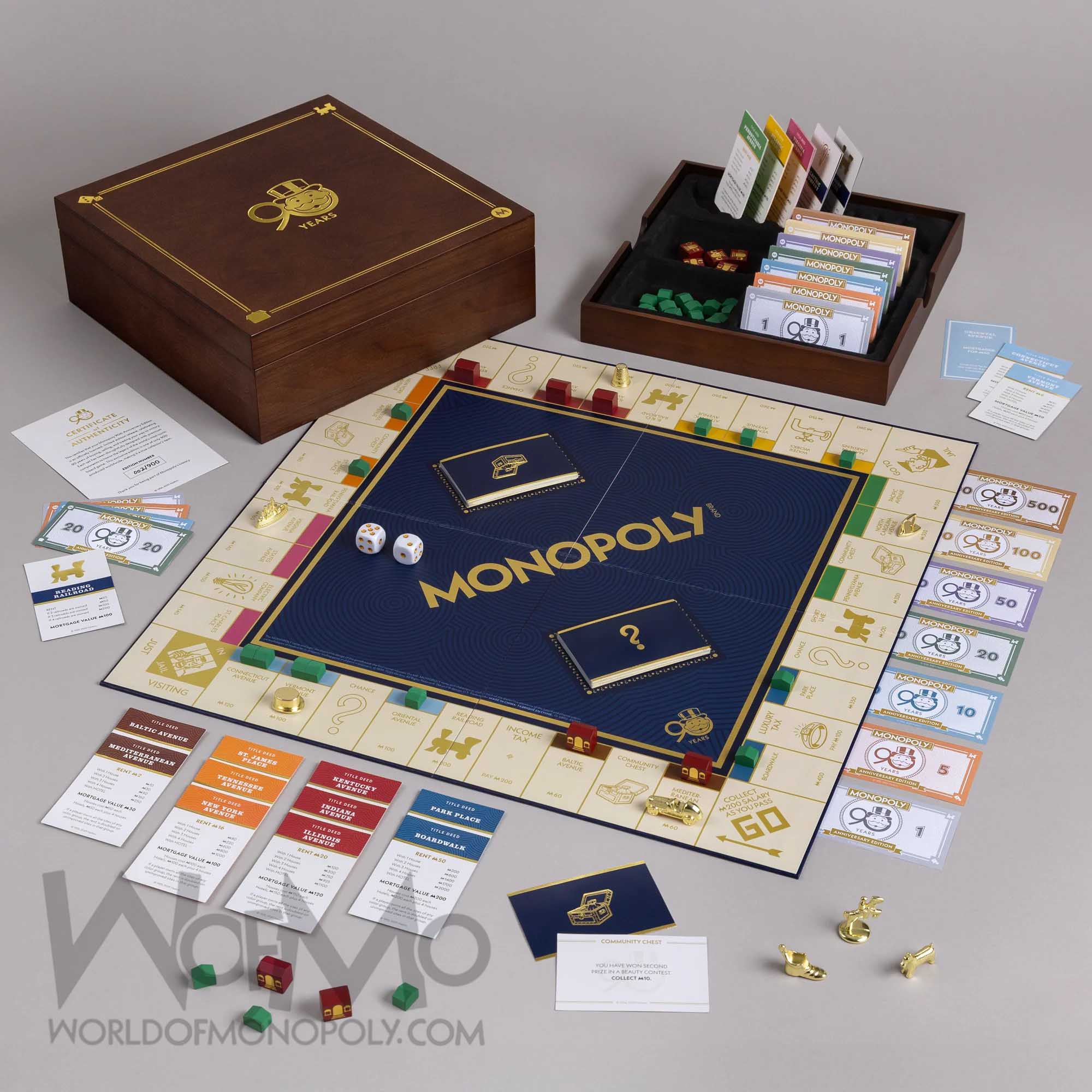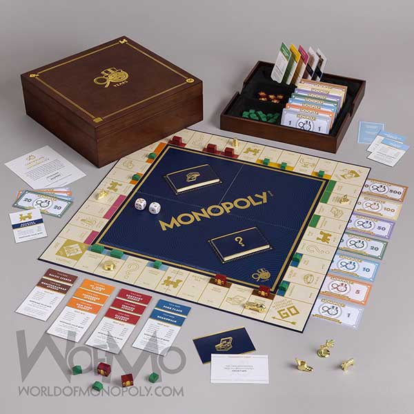 Premium stained wood foil-stamped box, folding game board featring accents and metallic ink, built-in storage with removable banker's tray, die-cast gold-toned metal tokens, wood houses and hotels, premium cards, money and dice.