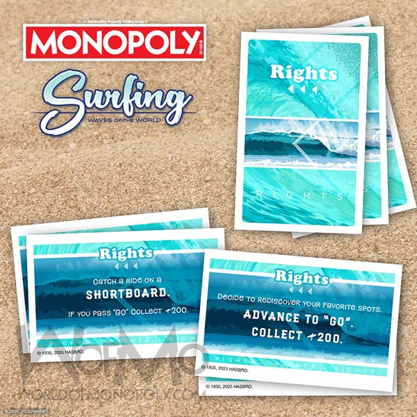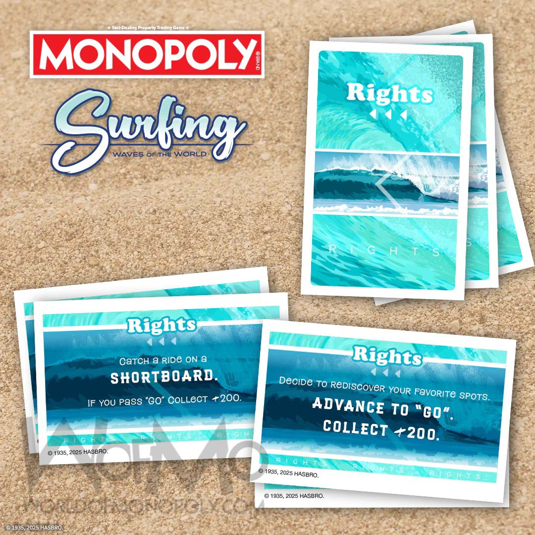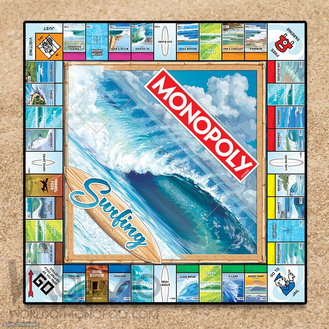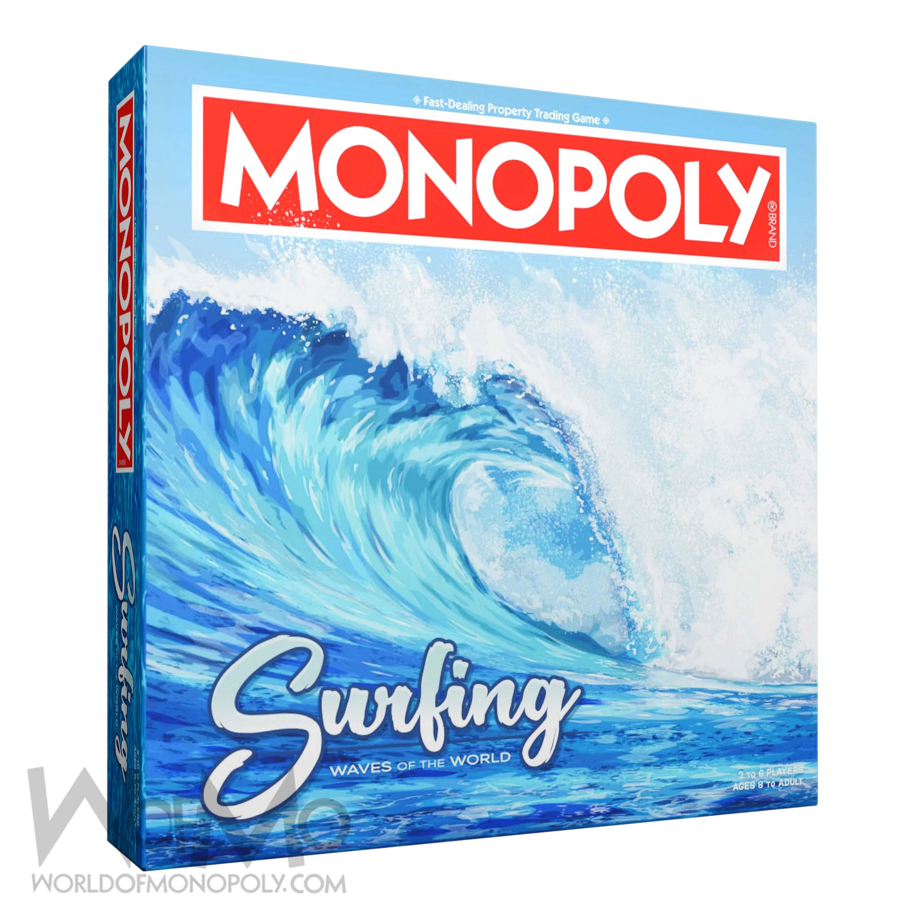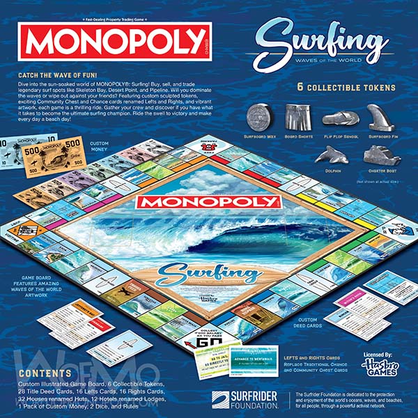 Ride the waves of fun and competition in MONOPOLY: Surfing! Buy, sell, and trade iconic surf spots like Cocoa Beach, Pipeline, and Superbank . Featuring 6 custom sculpted tokens – a surfboard fin, board shorts, a dolphin, and more! Dive into Community Chest and Chance cards that bring unexpected challenges, like catching the perfect wave or facing a gnarly wipeout. Gather your friends, and may the best surfer claim victory!