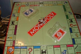 bord staat het woord MONOPOLY (met Suikeroompje) in open letters