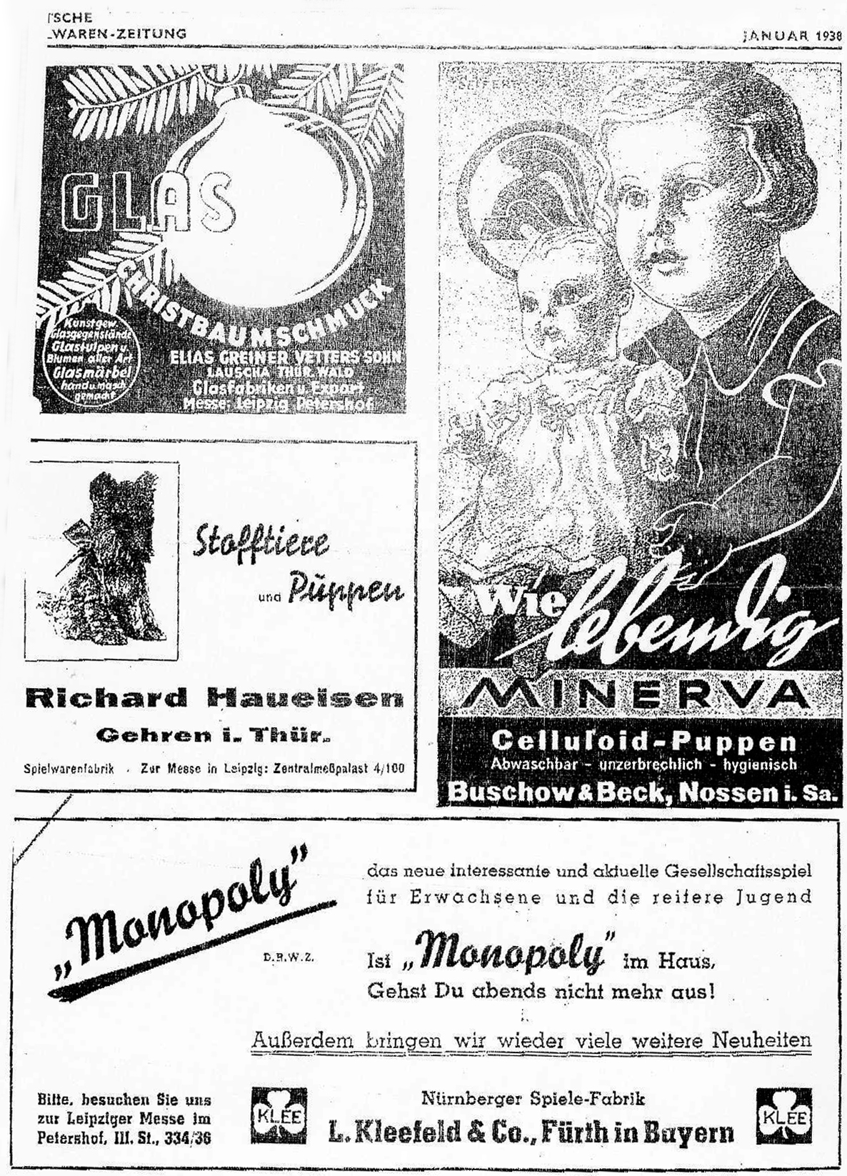 "The "Deutsche Spielwaren-Zeitung" (German Toys Paper) of January 1938 (click here for a higher quality picture) contains an advertisement of the Kleefeld company of their new game Monopoly, unfortunately without an image.