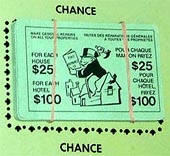 The title deeds (6.7x8.1 cm) are white on both sides. Instead of Chance- and Community Chest cards there are Contingency- and Big Fun! cards of 4.5x7.8 cm. Some of the instructions on these funny illustrated cards say: