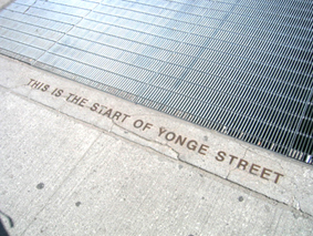 One Yonge Street is the Toronto Star building. Going north, we go past the Eaton Center, and through the Yonge Street strip.