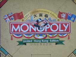 the new and old flag of Hong Kong. On the black backside a MONOPOLY emblem is