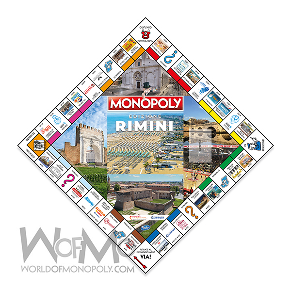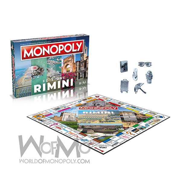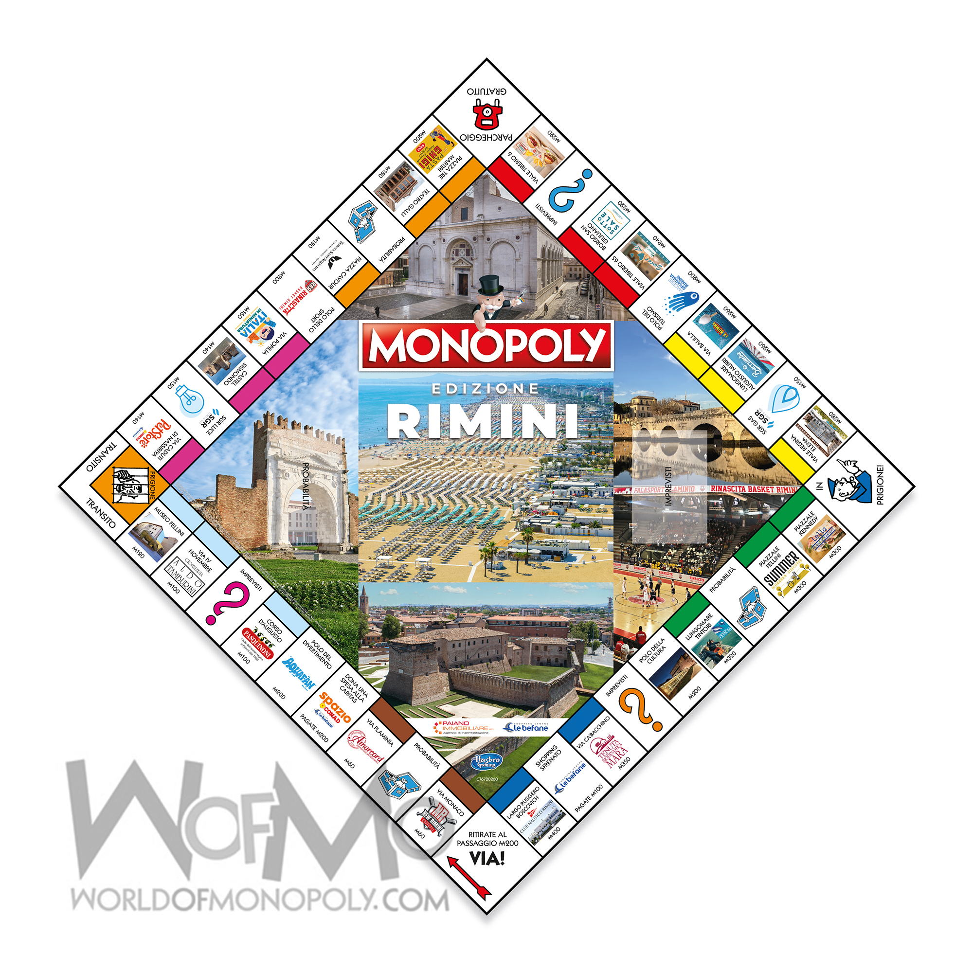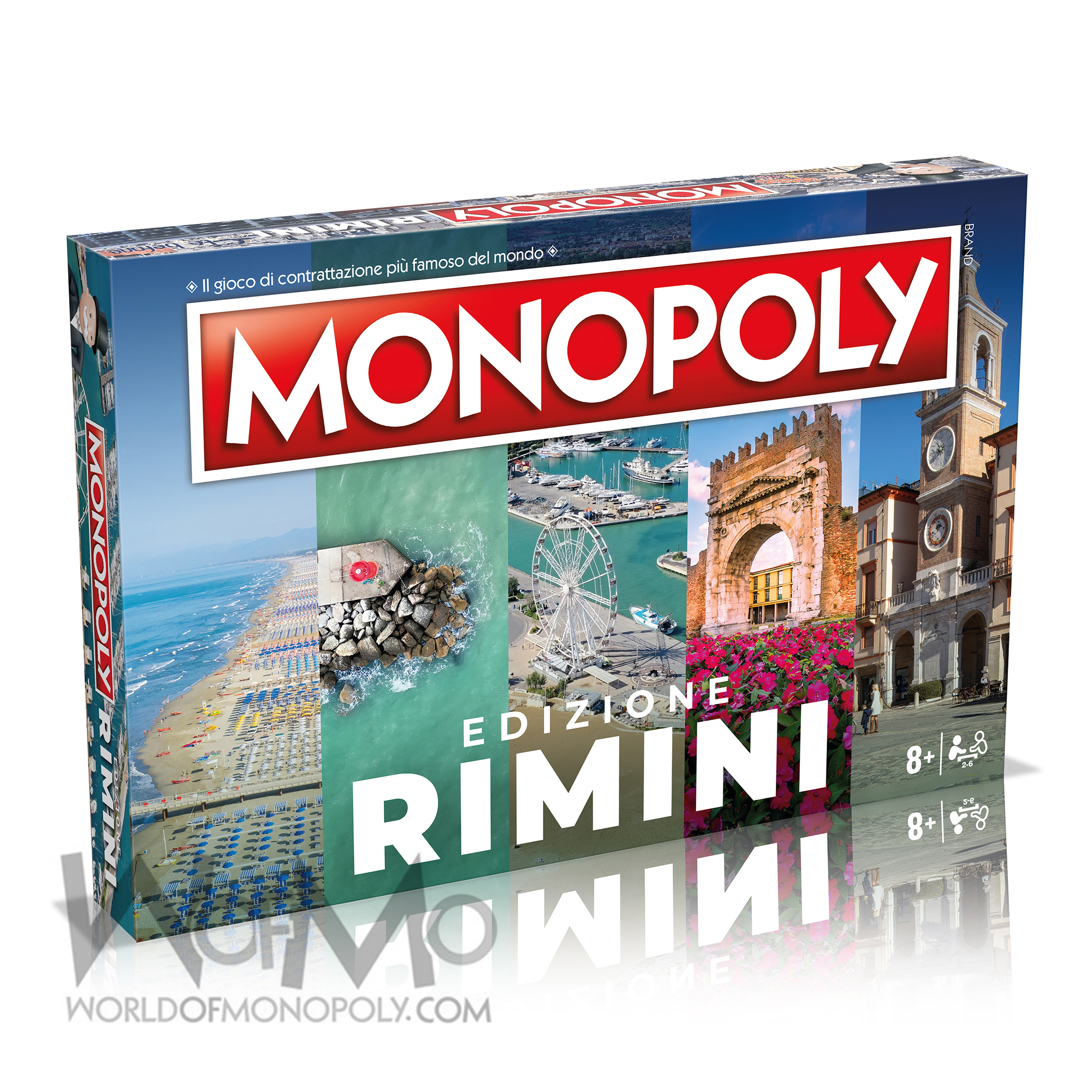 Monopoly Edition Rimini: A tribute to the city that most of all represents Italian summer tourism at an international level, the undisputed capital of entertainment" Made in the Romagna Riviera. From each box sold until 31 December 2023, 1 euro was donated to AIL , the Italian Association against Leukemia, Lymphomas and Myeloma of Rimini.