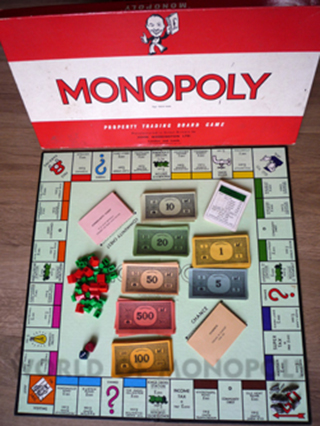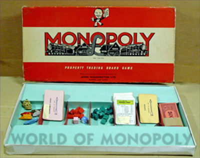 - In the middle of the game board Monopoly is written in open characters and the metal tokens are the same. However, the back of the board is black. The white plastic insert of the inner box has 7 square trays for the composing parts. It also has the inscription "One of the Waddington's wonderfull games".