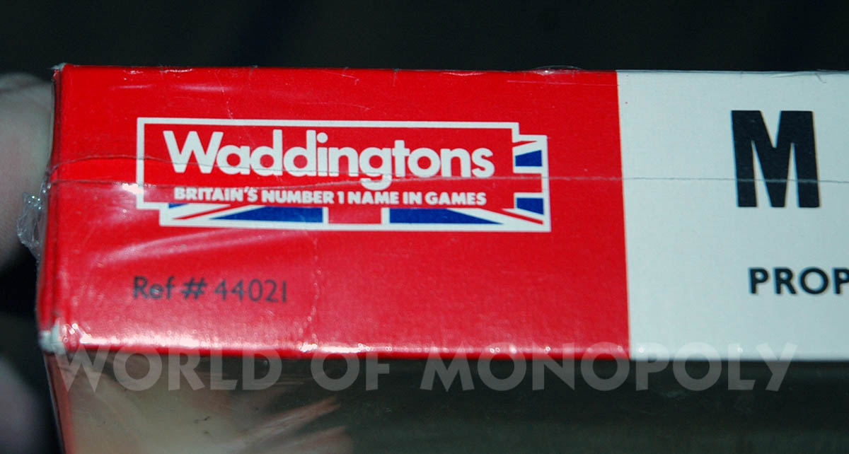 It is not clear why this set, manufactured in Waterford, Ireland for Waddingtons Games, has 2 reference numbers. Perhaps because the lid of the box is now also in red/white/red (ref.nr.44021 of 1984) and shows the "collection of attributes" (2 tokens, stack of banknotes; but not those belonging to the set!; 2 stacks of property deeds; 2 dice; 2 houses and 3 hotels) as well, as they appear on the other European sets, manufactured in Ireland since 1992 (with ref.nr.06951).