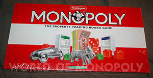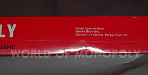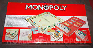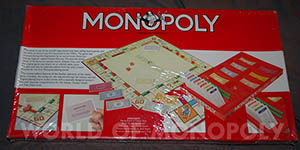 The strong board with red back shows the word Monopoly in its centre with open characters parallel to the first side. The fold of the board is parallel to side 2. The banknotes are according the new austere design, without any copyright mention and with a black bar in the upper part of the circle with "Monopoly with Uncle Pennybags". These banknotes are also used with the Hasbro sets with Ref. Nr. 14535 since 1996.