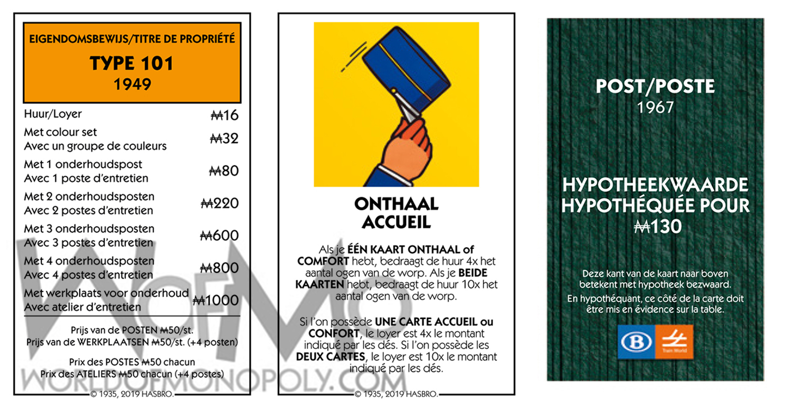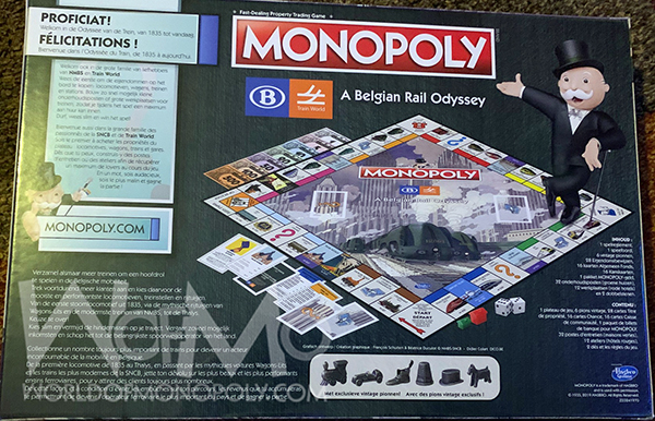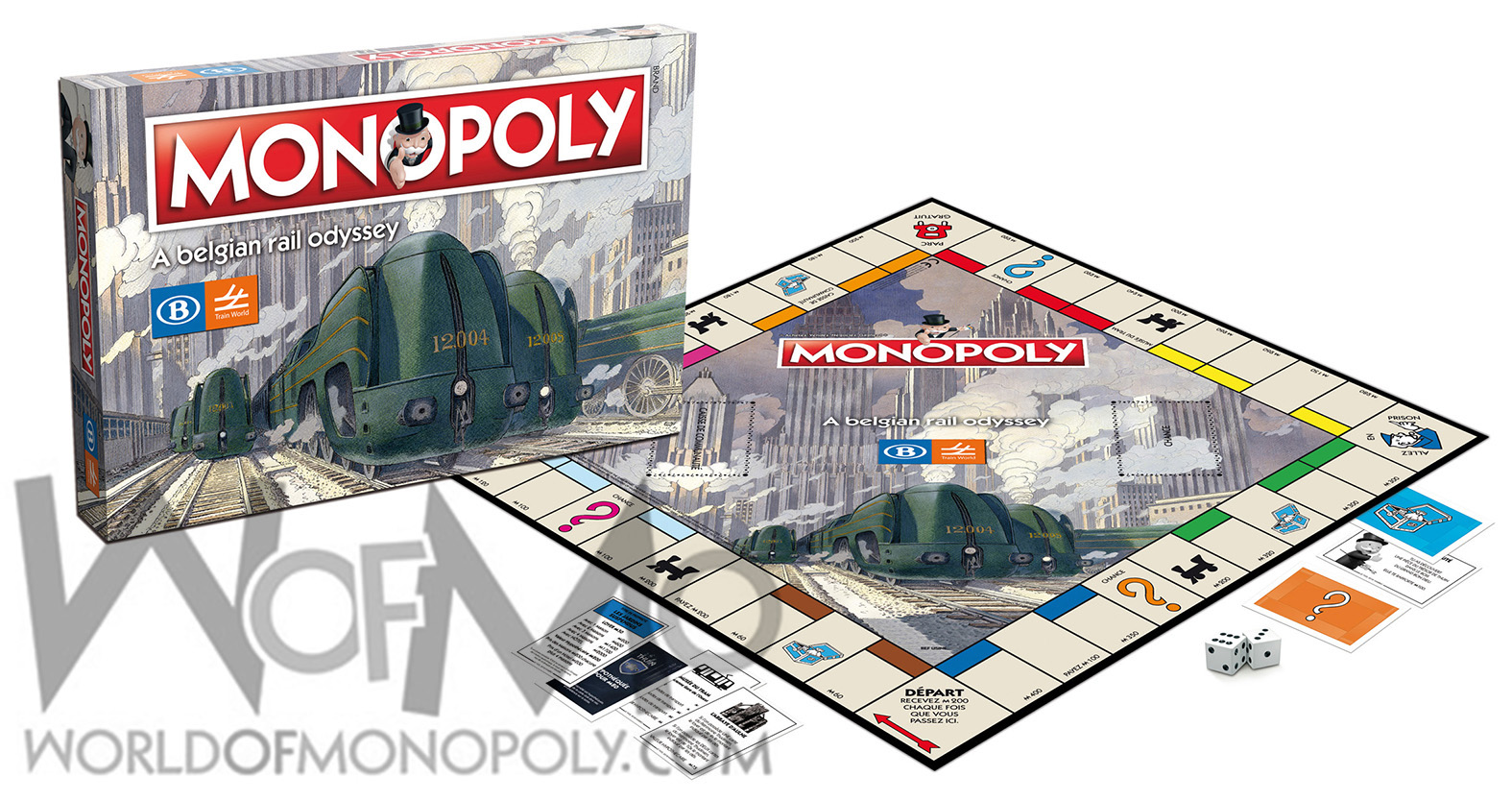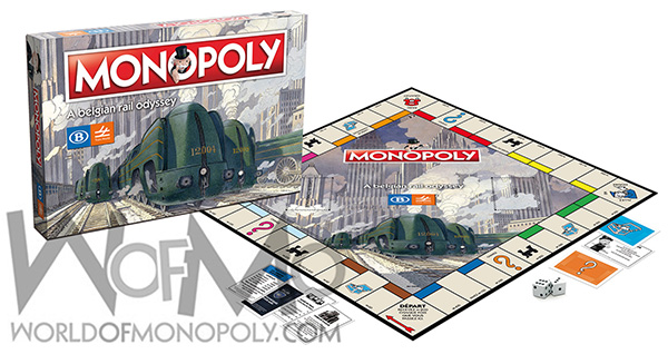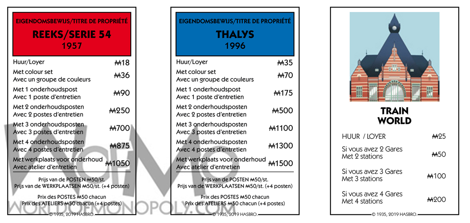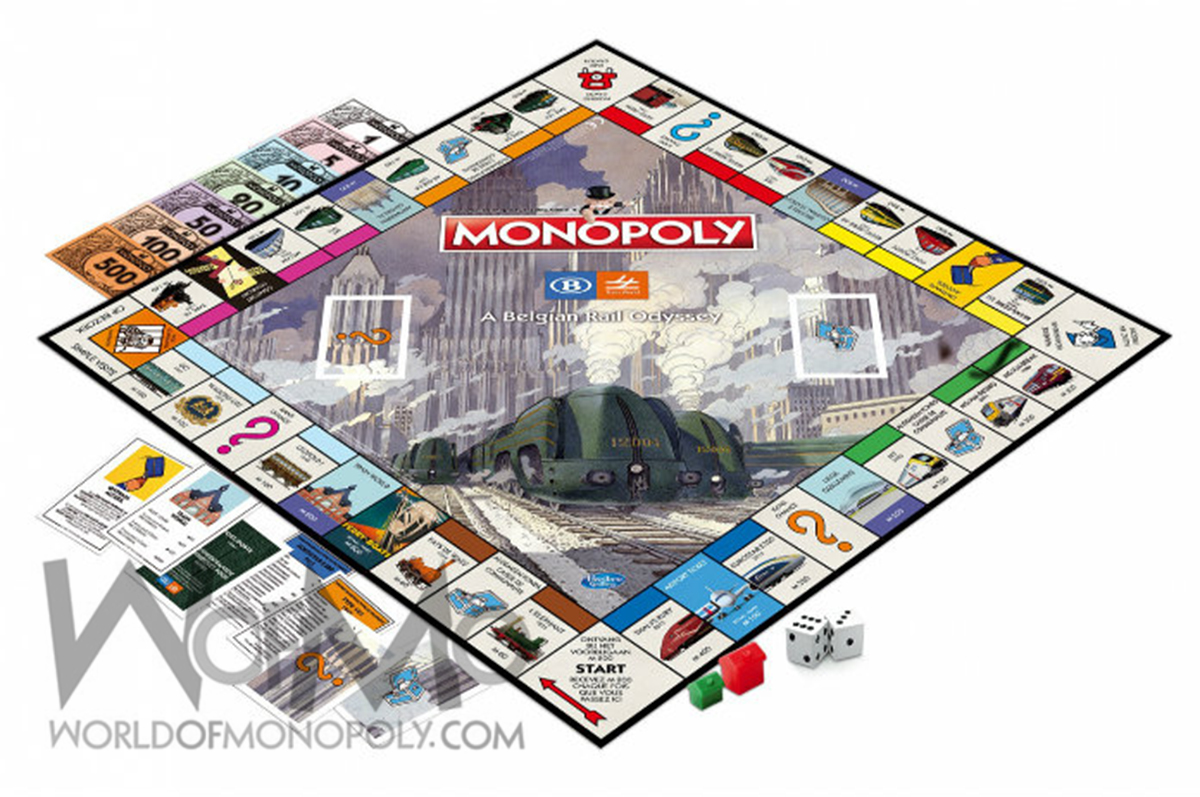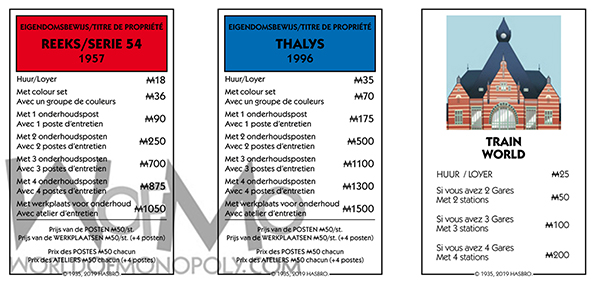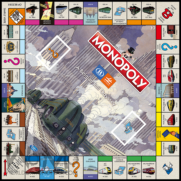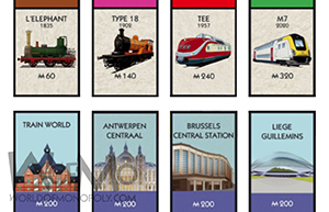 The traditional streets in the game have been replaced by locomotives: from the first locomotive from 1835, over the Wagons-Lits carriages, to the most modern NMBS trains and the high-speed trains Eurostar and Thalys. There are also stations for sale, and the players can build maintenance posts and workshops. It is especially illustrated with a beautiful drawing of the locomotive type 12 by François Schuiten, the scenographer of Train World.