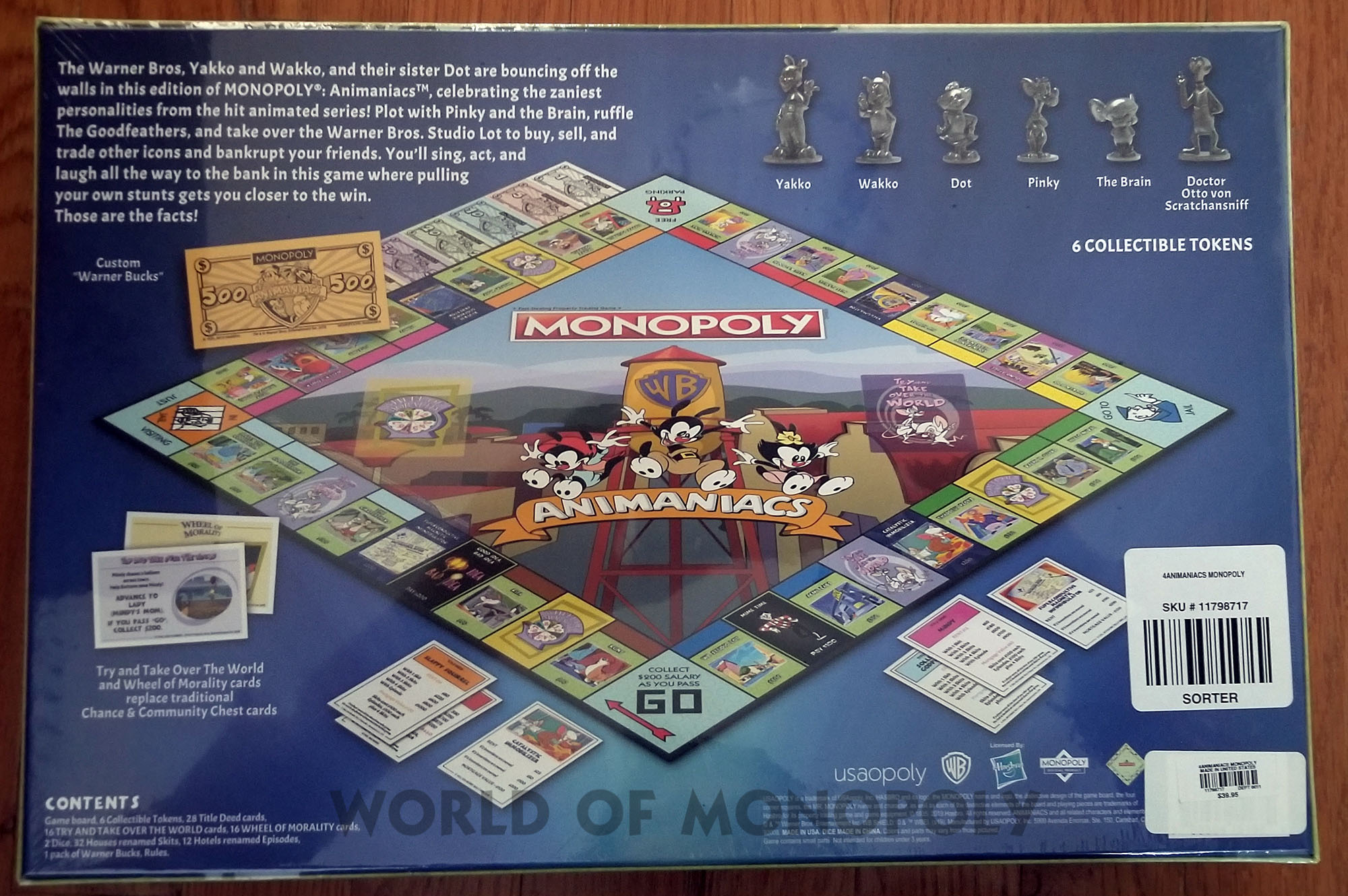 Six Collectible Tokens: Yakko, Wakko, Dot, Pinky, The Brain, Doctor Otto von Scratchansniff; 28 Title Deed Cards; 16 Chance Cards renamed TRY AND TAKE OVER THE WORLD Cards; 16 Community Chest Cards renamed WHEEL OF MORALITY Cards; Custom Warner Bucks Money; 32 Houses renamed Skits and 12 Hotels renamed Episodes.