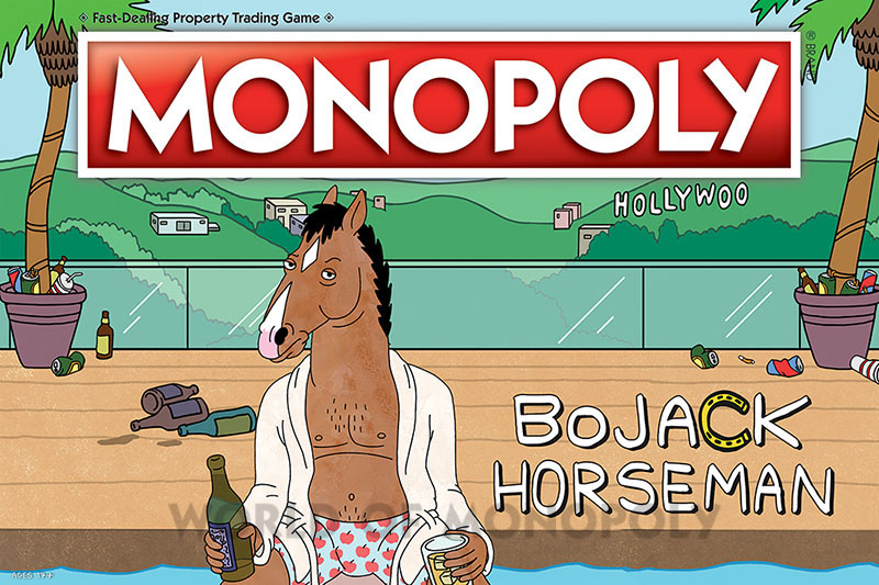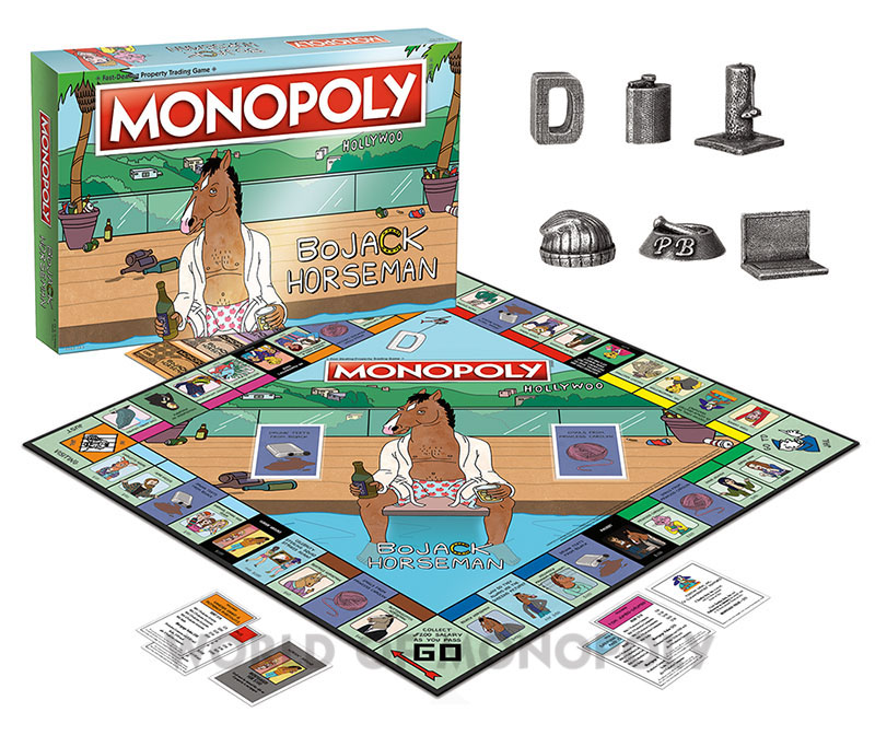 Custom designed game board featuring characters from the TV series. Houses are renamed Production Company, Hotels are renamed Studio. Custom Community Chest (Emails from Princess Carolyn) cards and custom Chance (Drunk Texts from BoJack) cards. Custom BoJack Horseman Themed Money.