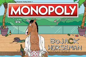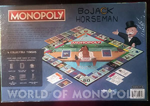 Custom designed game board featuring characters from the TV series. Houses are renamed Production Company, Hotels are renamed Studio. Custom Community Chest (Emails from Princess Carolyn) cards and custom Chance (Drunk Texts from BoJack) cards. Custom BoJack Horseman Themed Money.