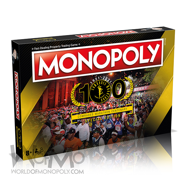 ABOUT THE GAME: Special Limited Centenary Edition; First ever Road Race Monopoly in the World; Custom board, properties, money and cards "Down" version of the world famous race; For properties, all the Comrades Marathon route landmarks were used.; For the most expensive properties the Down Run Course Records were use, Fastest Times by Foreign Runners and the record of 9 win records; Pietermaritzburg Start / Durban Finish; Travel Locations are 4 of the previous "Down" Run finish Venues in Durban; For the Traditional Tax locations we used 2 cut-off times on the "Down" Run Route; Comrades Marathon House and the Comrades Marathon Wall of Honour are used for the Traditional Utility properties; Chance and Community Chess cards feature as "Down" Run and "Up" Run.