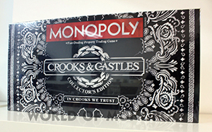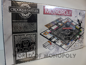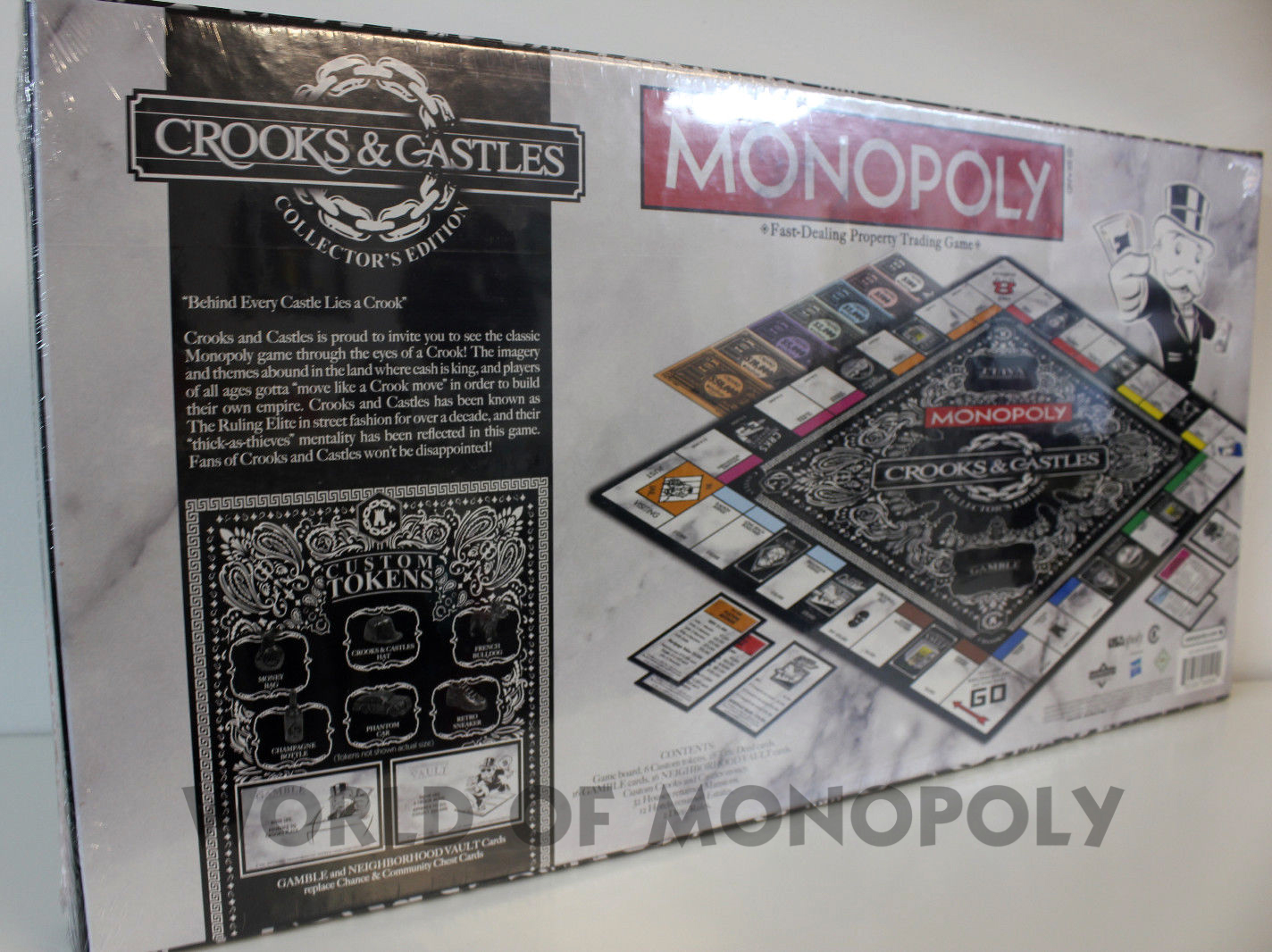 Includes: Game board, 6 Custom tokens, 28 Title Deed cards, 16 GAMBLE cards, 16 NEIGHBORHOOD VAULT cards, Custom Crooks and Castles money, 32 Houses renamed Mansions, 12 Hotels renamed Estates, 2 Dice, Rules