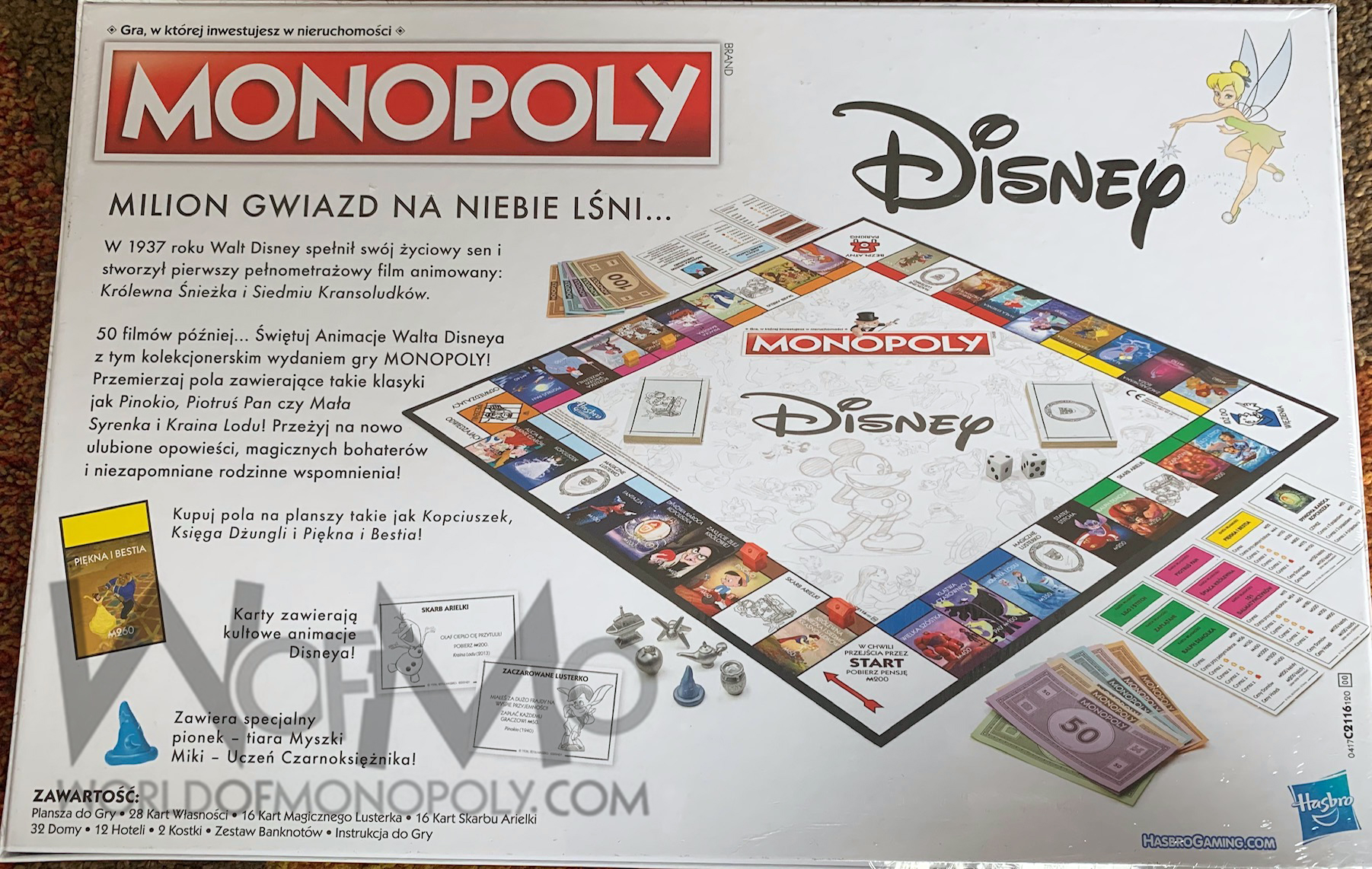 From Pinocchio and Peter Pan to The Little Mermaid and Frozen, players can imagine and recall the beloved stories, magical characters, and unforgettable family memories. In this edition, players move around the Disney-themed gameboard, building hotels and houses, buying Disney Movies, Vehicles, Magical Objects, and creating new Disney family memories.