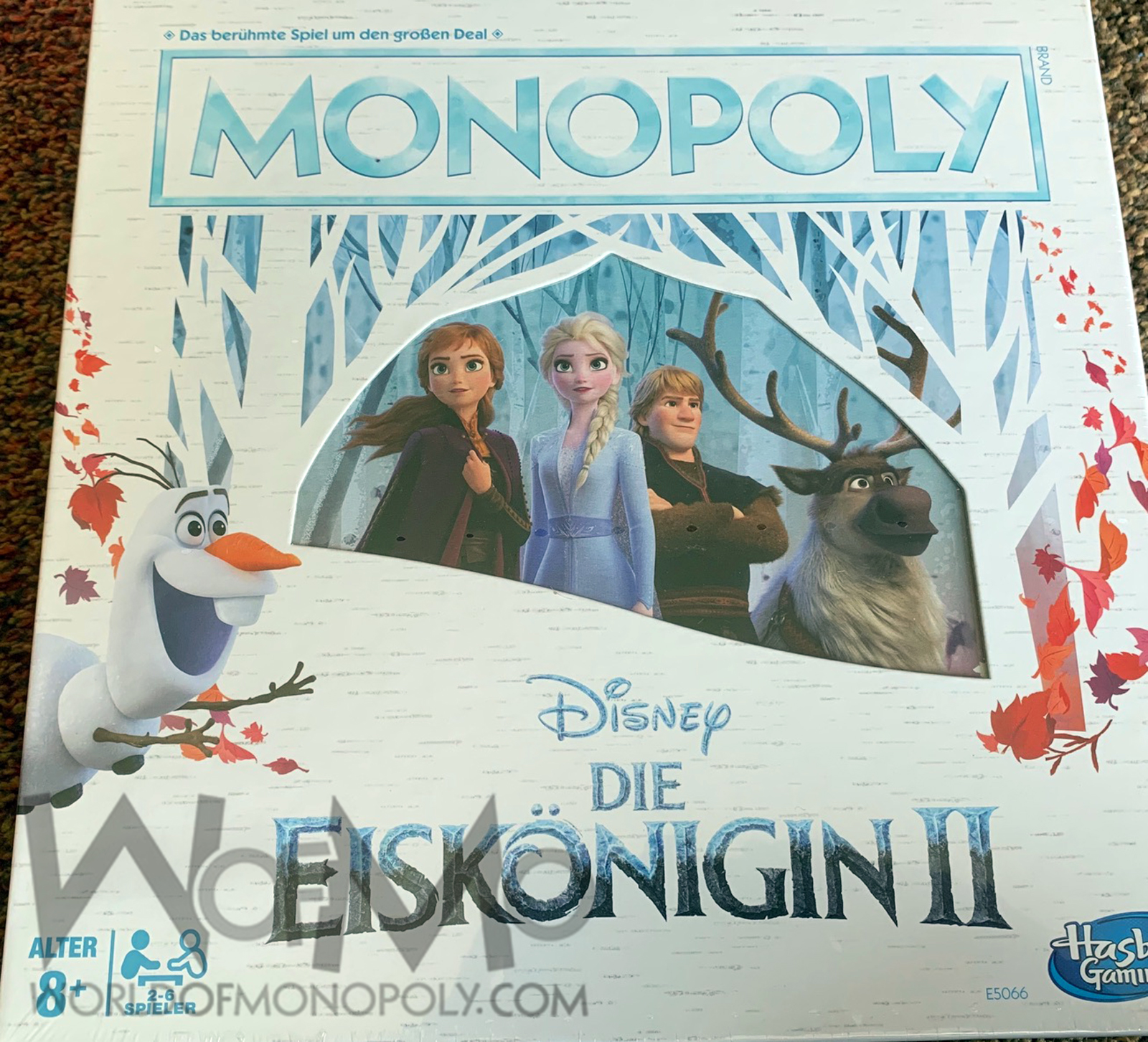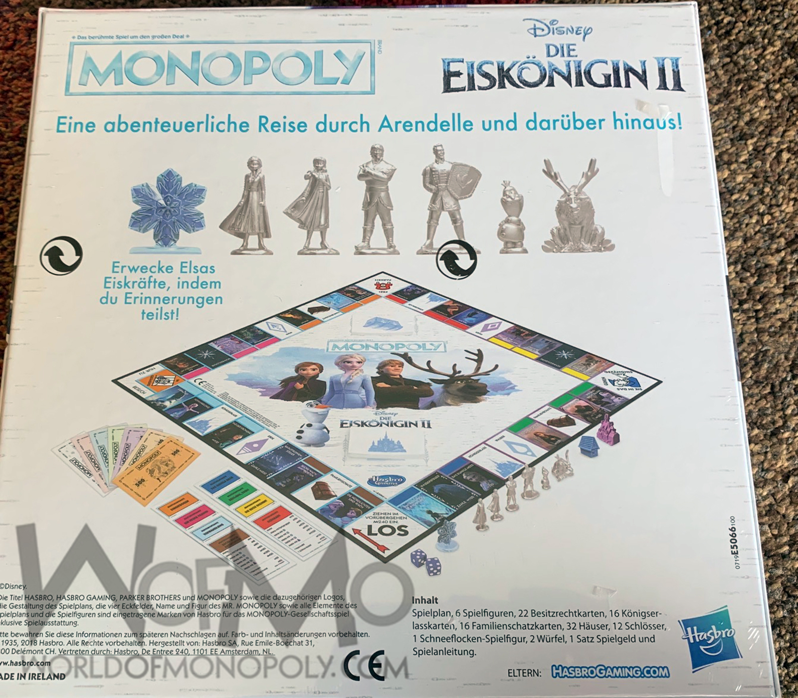 In this version of the Monopoly game kids can buy Village Dwellings and Castles -- scenes inspired by the Disney Frozen II movie. The Monopoly game: Disney Frozen II Edition comes with 6 character tokens: Elsa, Anna, Hans, Kristoff, Olaf, and Sven.