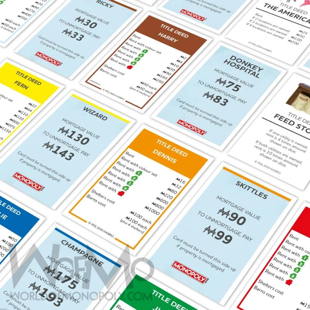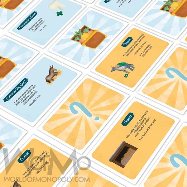 Exclusive game components includes a custom game board, six bespoke tokens, themed Title Deed cards, customised Chance and Community Chest cards, 32 wooden Shelters, 12 wooden Barns, wooden dice, custom money and a game guide.