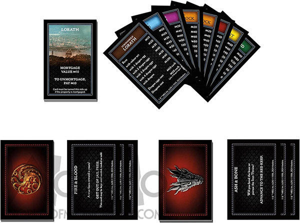 GAMEBOARD FEATURES LOCATIONS FROM THE SHOW: Journey through Westeros and Essos taking control of as many strongholds, lands, and bays as you can. The more your control, the more rent you can collect.