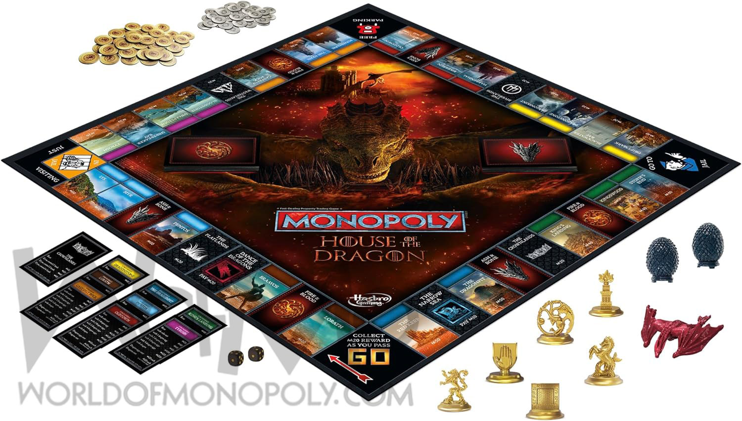 HOUSE OF THE DRAGON-THEMED MONEY: Includes 102 themed cardboard coins. The last player with coins when all others have gone bankrupt wins.