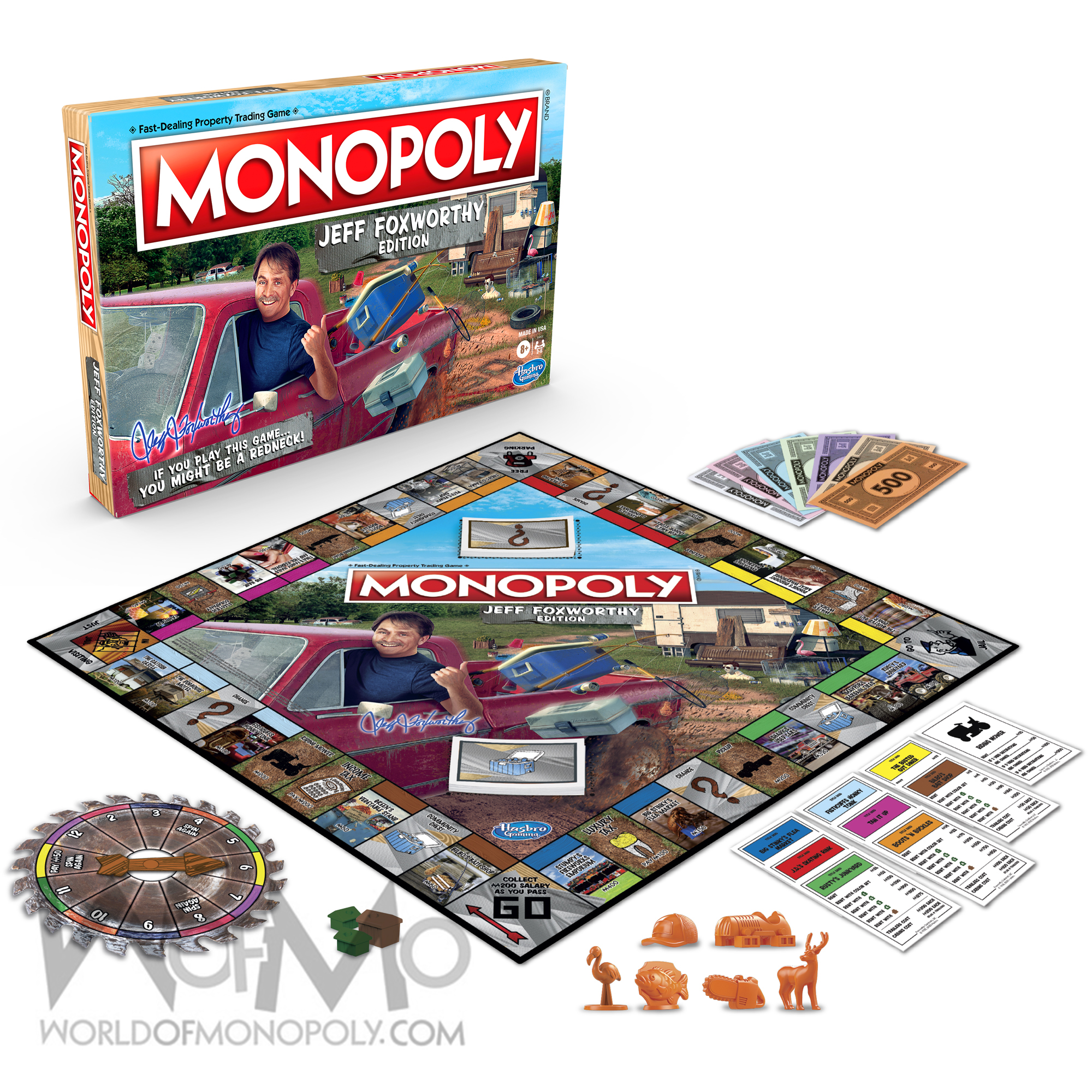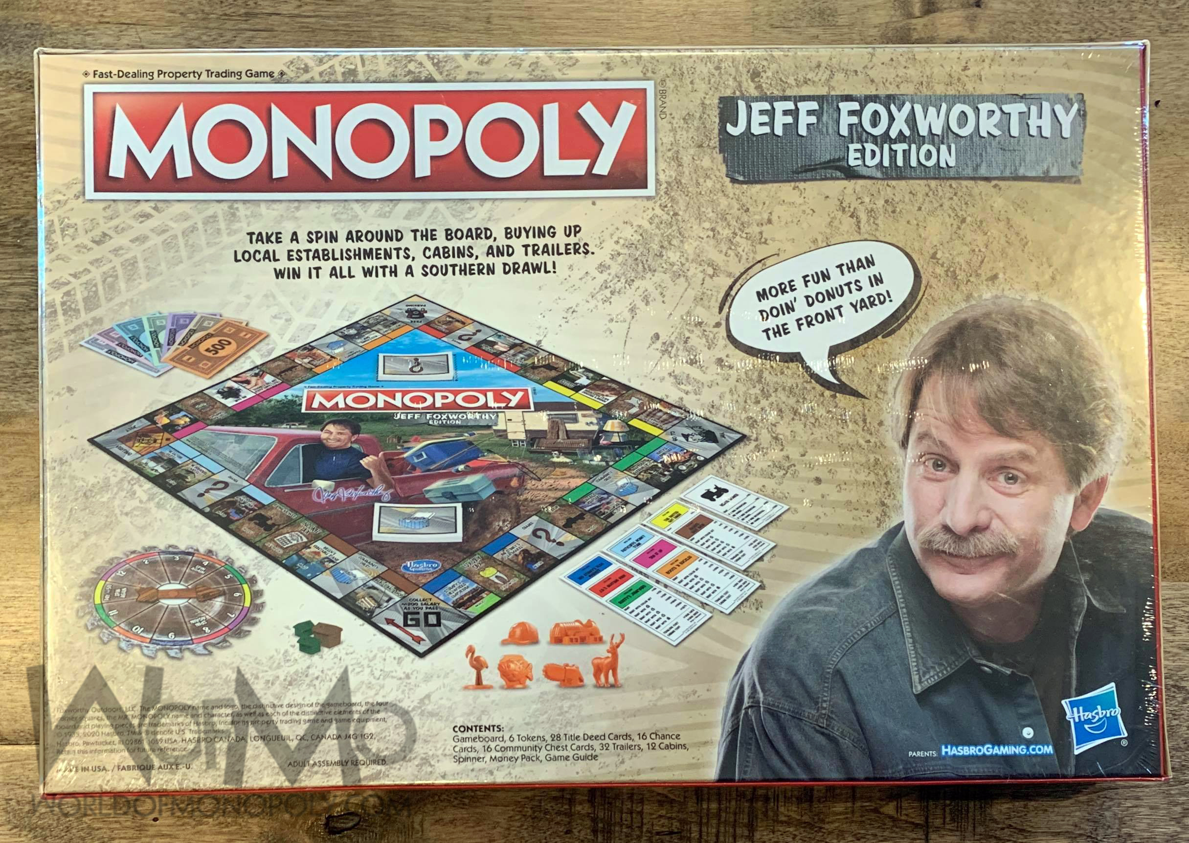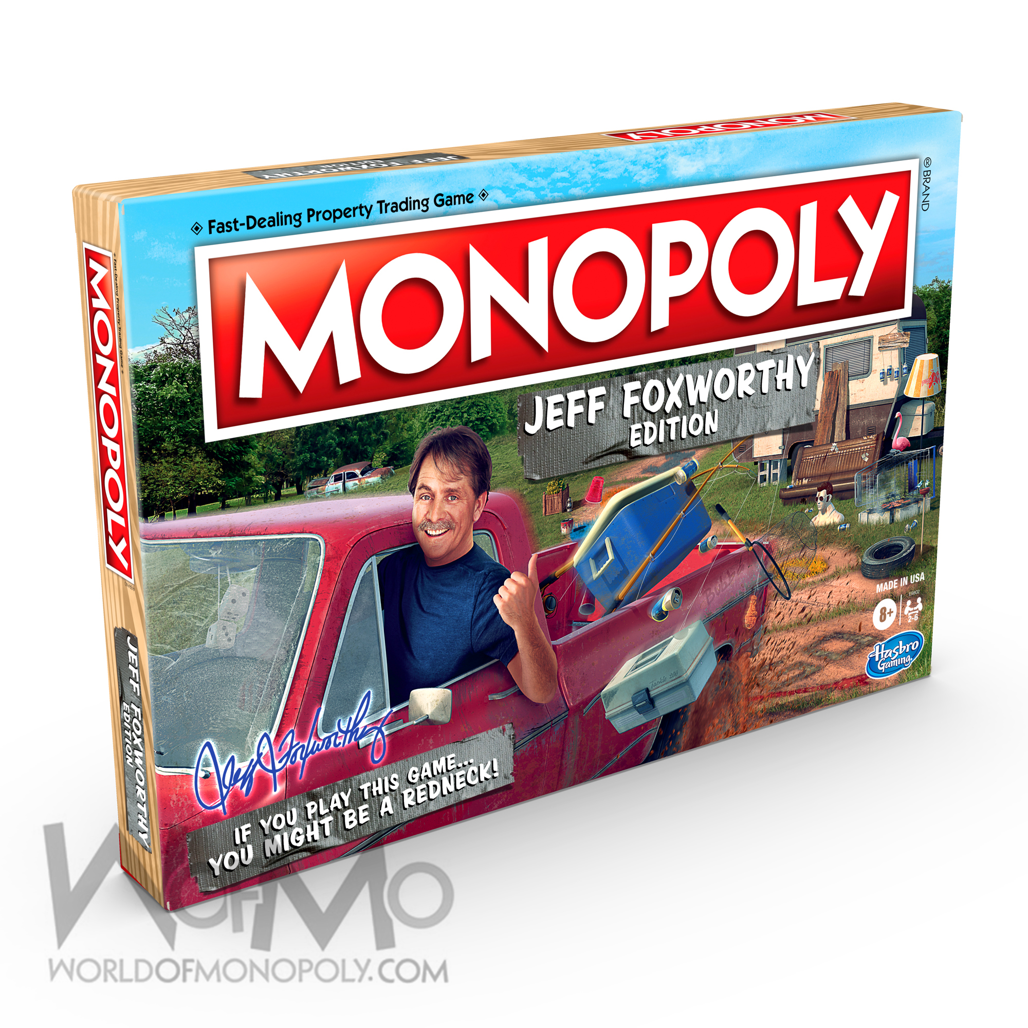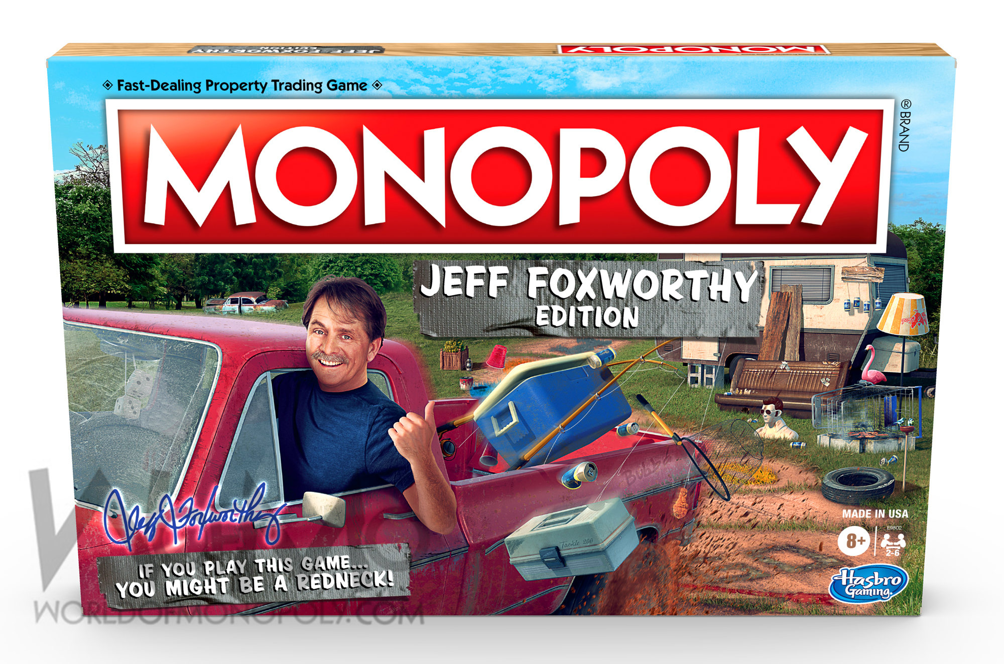 INSPIRED BY JEFF FOXWORTHY: If you play this game, you might be a redneck! Buy, sell, trade, and scheme to win it all with the Monopoly: Jeff Foxworthy Edition board game.