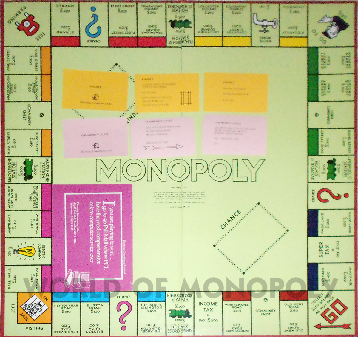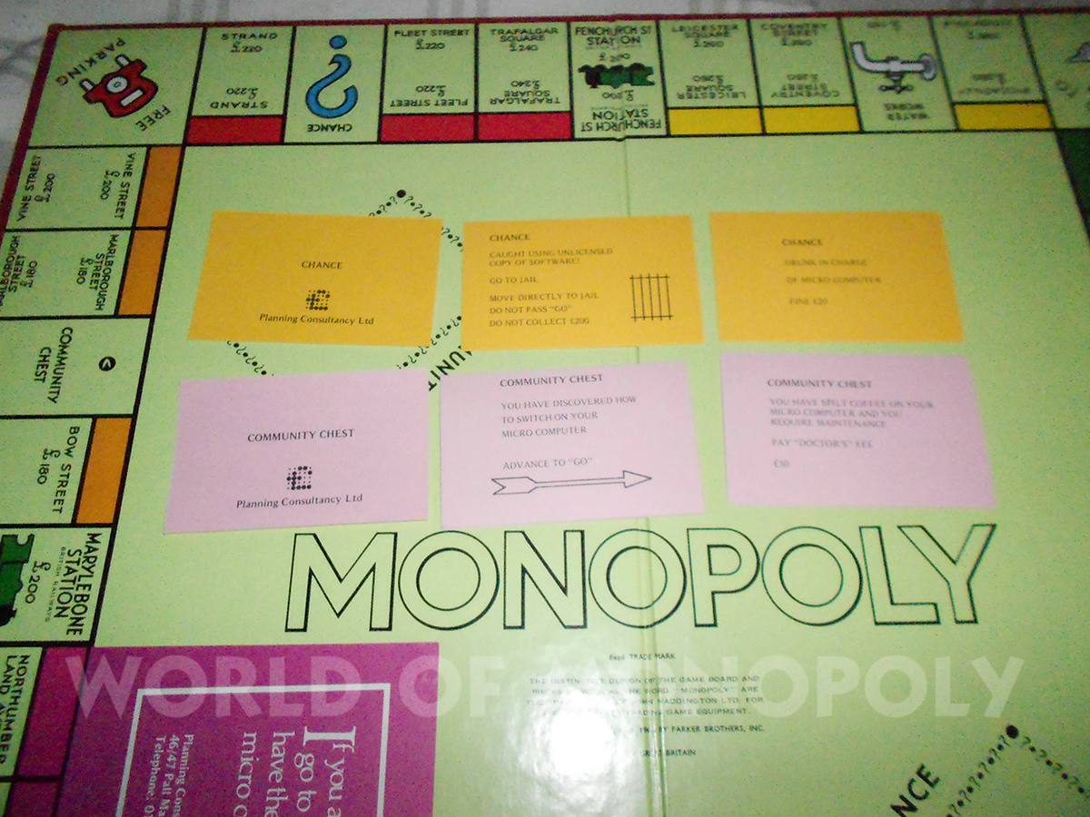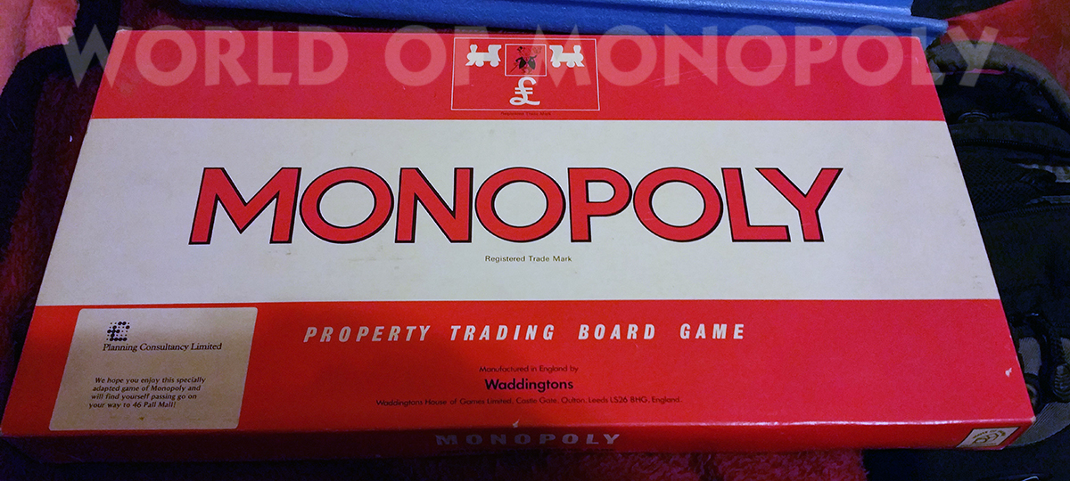 This version was made for Planning Consultancy Limited who were located at 46 Pall Mall in London, but no longer exists. It is just the basic English board with a large sticker placed on it in the "Pall Mall" corner. The Community Chest and Chance cards had their logo printed on them but otherwise it is the same set from the same era.