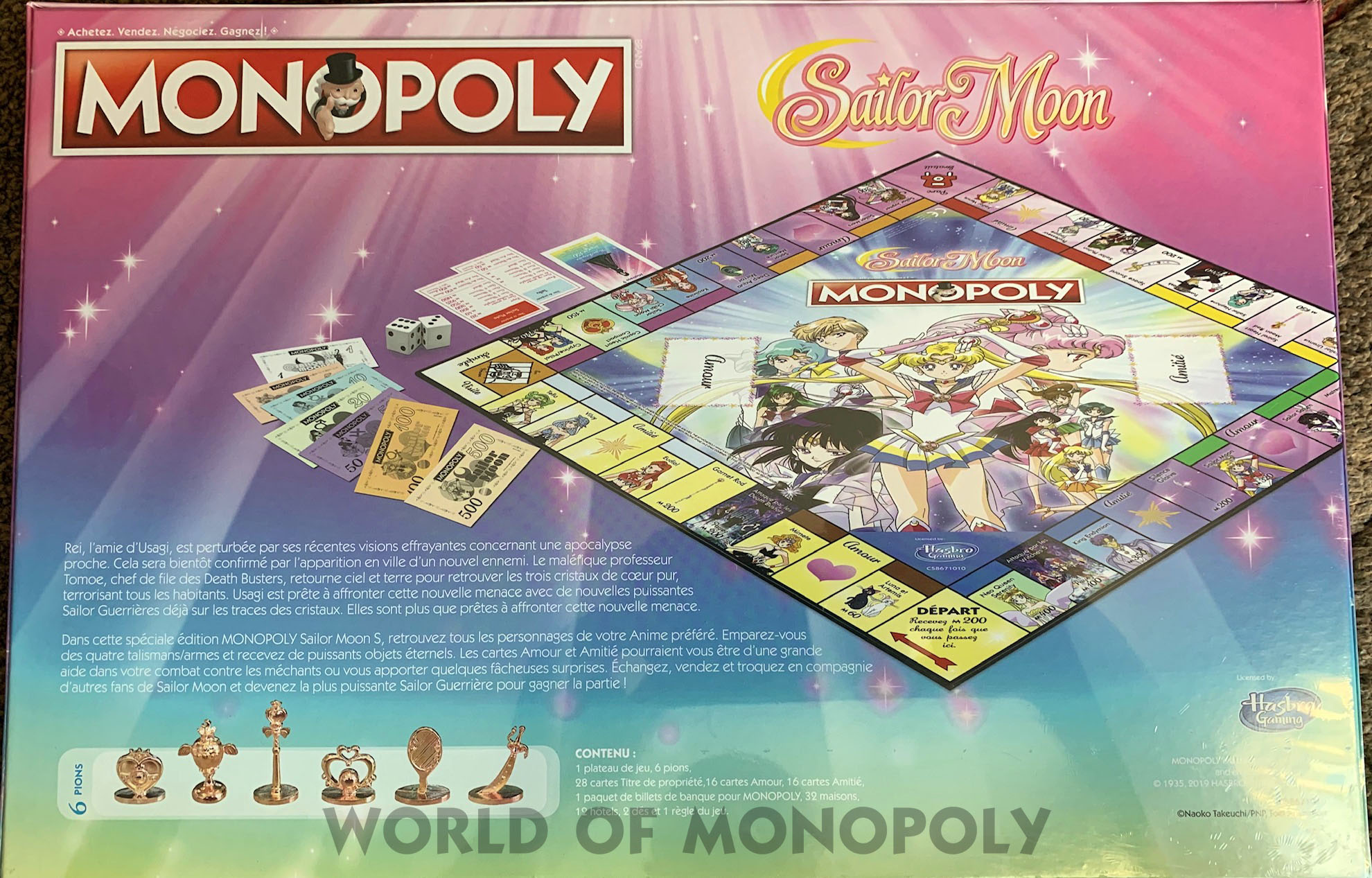 Allows players to take their chances with custom FRIENDSHIP and LOVE cards replace Chance and Community Chest cards. Includes custom Sailor Moon Money. This Limited Edition Set Includes: 6 collectible tokens: Cosmic Heart Compact, Moon Chalice, Spiral Heart Moon Rod, Garnet Orb, Deep Aqua Mirror and Space Sword. Custom game board featuring all the characters of the beloved anime Sailor Moon.