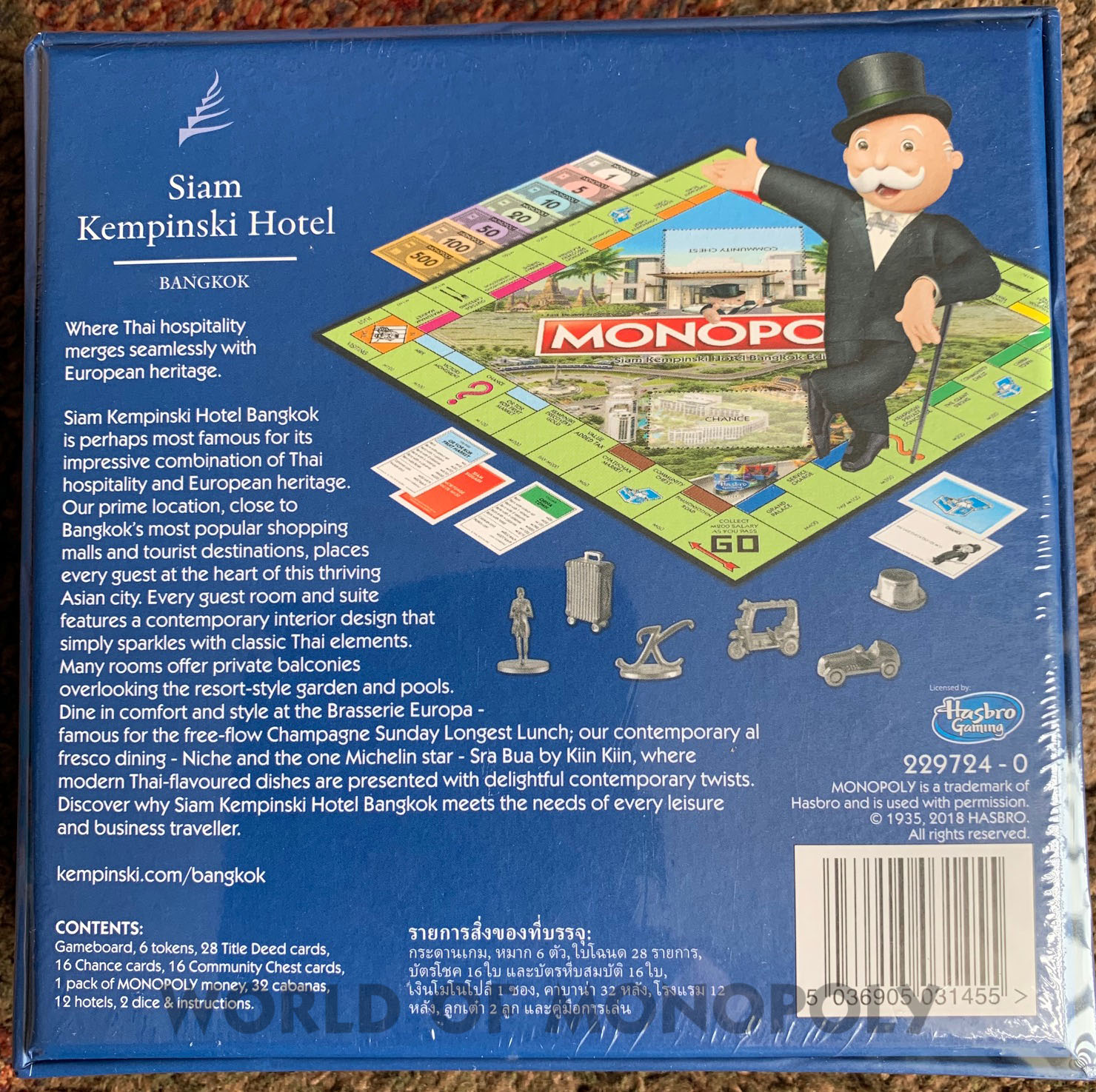 For the exclusive version of the game exclusive monopoly. In the style of the Siam Kempinski Hotel Bangkok, players must compete for the richest and most powerful property in Bangkok. The concept of the hotel and simulate the locations around Bangkok. It's a piece of walking, including a description on the board.