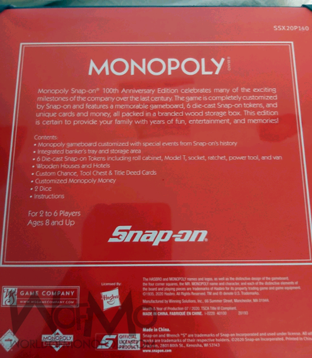 Monopoly Snap-on 100th Anniversary Edition celebrates many of the exciting milestones of the company over the last century. The game is completely customized by Snap-on and features a memorable gameboard, 6 die-cast Snap-on tokens, and unique cards and money, all packed in a branded wood storage box. This edition is certain to provide your family with years of fun, entertainment, and memories!