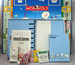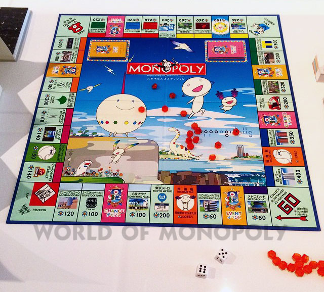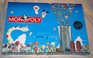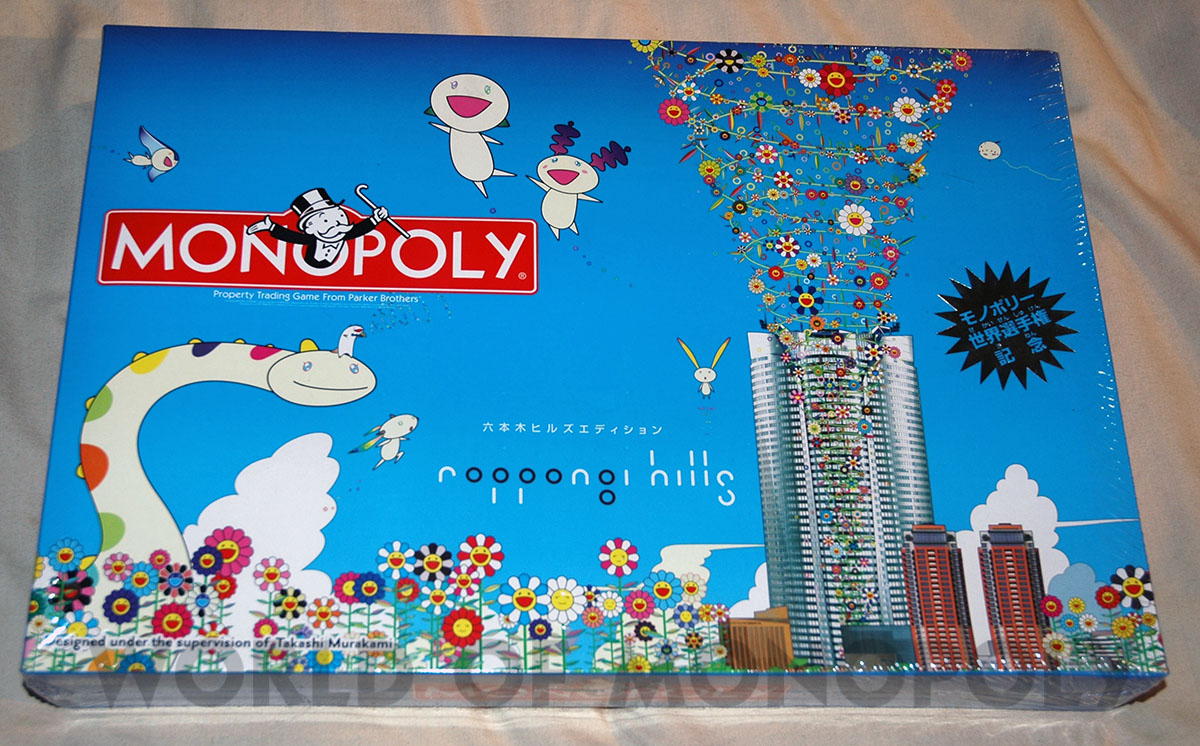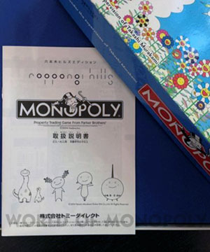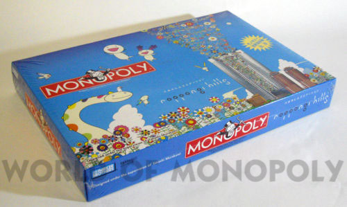 Famed Japanese artist Takashi Murakami has even given a traditional board game a modern design make-over - and here it is! This limited edition Tokyo Roppongi Hills Monopoly game is brand-new, unopened, and still wrapped-in-plastic. Every four years — just like the Olympics — 40 players from around the world gather to battle it out over a board game in the Monopoly World Championships. In 2004, this event was hosted at the incredible shopping/living center of Roppongi Hills in Tokyo, Japan, with Spaniard Zafra Fernandez ousting Japan’s Utaka Okada as world champion. To commemorate this competition, the Hasbro Toy Company asked artist Takashi Murakami to oversee the design of a special Roppongi Hills board. The properties on the board are all actual shops within the Roppingi Hills complex, and the pieces reflect the best of Murakami and Roppongi Hills — the counters are designed in the shape of the Mori Tower, and the set even comes with a Roppongi Hills handbook. The writing on the board is in both Japanese and English.