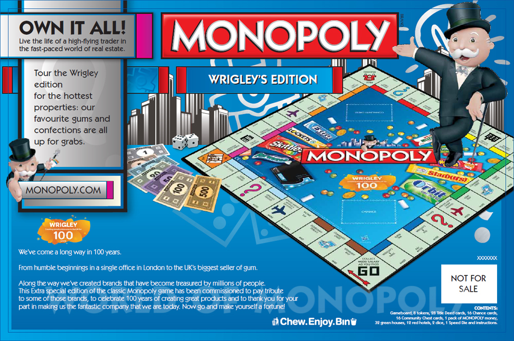 Along the way we've created brands that have become treasured by millions of people. This Extra special edition of the classic Monopoly game has been commissioned to pay tribute to some of those brands, to celebrate 100 years of creating great products and to thank you for your part in making us the fantastic company that we are today. Now go and make yourself a fortune!