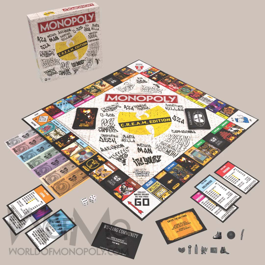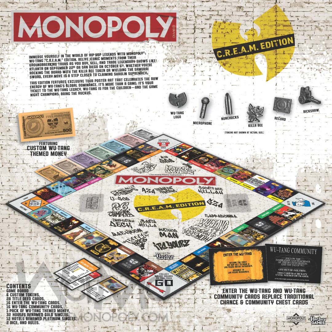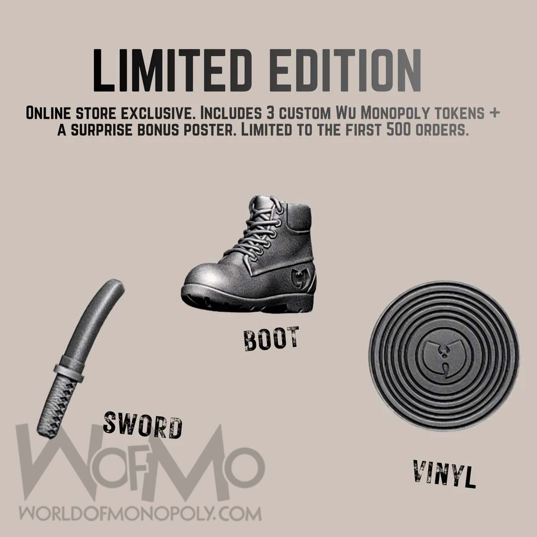Features: Custom Wu-Tang Game Board, 3 Exclusive Wu Monopoly Tokens: the Boot, Sword, and Vinyl limited to the first 500 orders, 28 Title Deed Cards, 16 Enter the Wu Tang Cards, 16 Wu Tang Community Cards 32 Houses renamed Gold Singles, 12 Hotels renamed Platinum Singles, Money, Dice, Rules, Stunning Poster Art From Wu-Tang’s Epic Tour Stops.