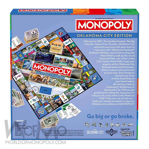 Welcome to OKC – The Modern Frontier! Celebrate the heart and soul of Oklahoma City in this exciting, local edition of the world’s most famous board game — MONOPOLY: Oklahoma City Edition! From the buzz of Bricktown to the peaceful views of Scissortail Park, players can buy, sell, and trade their favourite OKC landmarks as they build their city empire. Explore everything that makes "The Big Friendly" shine — from cowboy culture to cutting-edge art, delicious dining to iconic districts. Will you make your fortune on Oak Avenue or lose it all taking a wrong turn downtown? Roll the dice, embrace the Oklahoma Standard, and see if you have what it takes to own it all in Oklahoma City!
