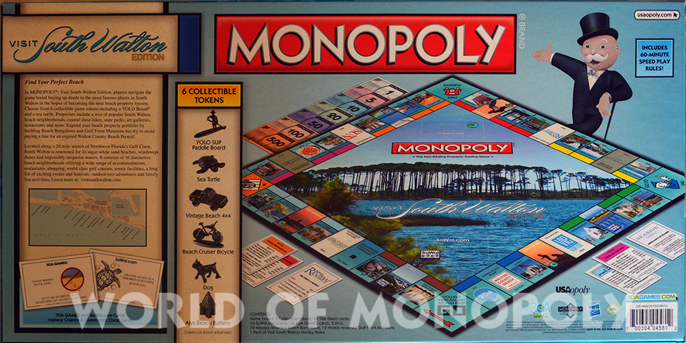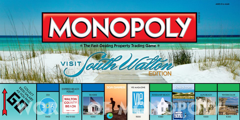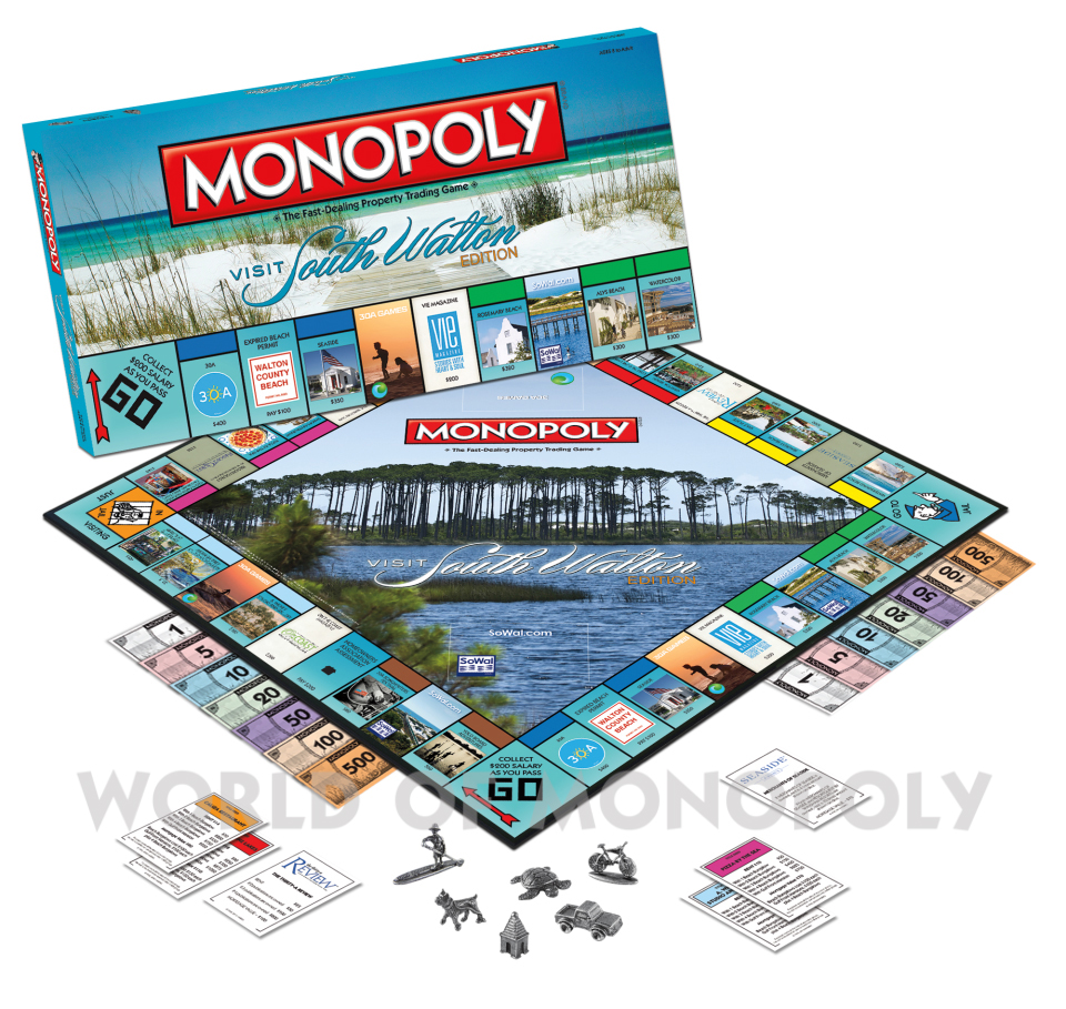In Monopoly: Visit South Walton Edition, players navigate the game board buying up deeds to the most famous places in South Walton in the hopes of becoming the next beach property tycoon. Choose from 6 collectible gam tokens including a YOLO Baord and a sea turtle. Properties include a mix of popular South Walton beach neighborhoods, coastal dune lakes, state parks, art galleries, restaurants and more. Expand your beach property portfolio by building Beach Bungalows and Gulf Front Mansions but try to avoid paying a fine for an expired Walton County Beach Permit!