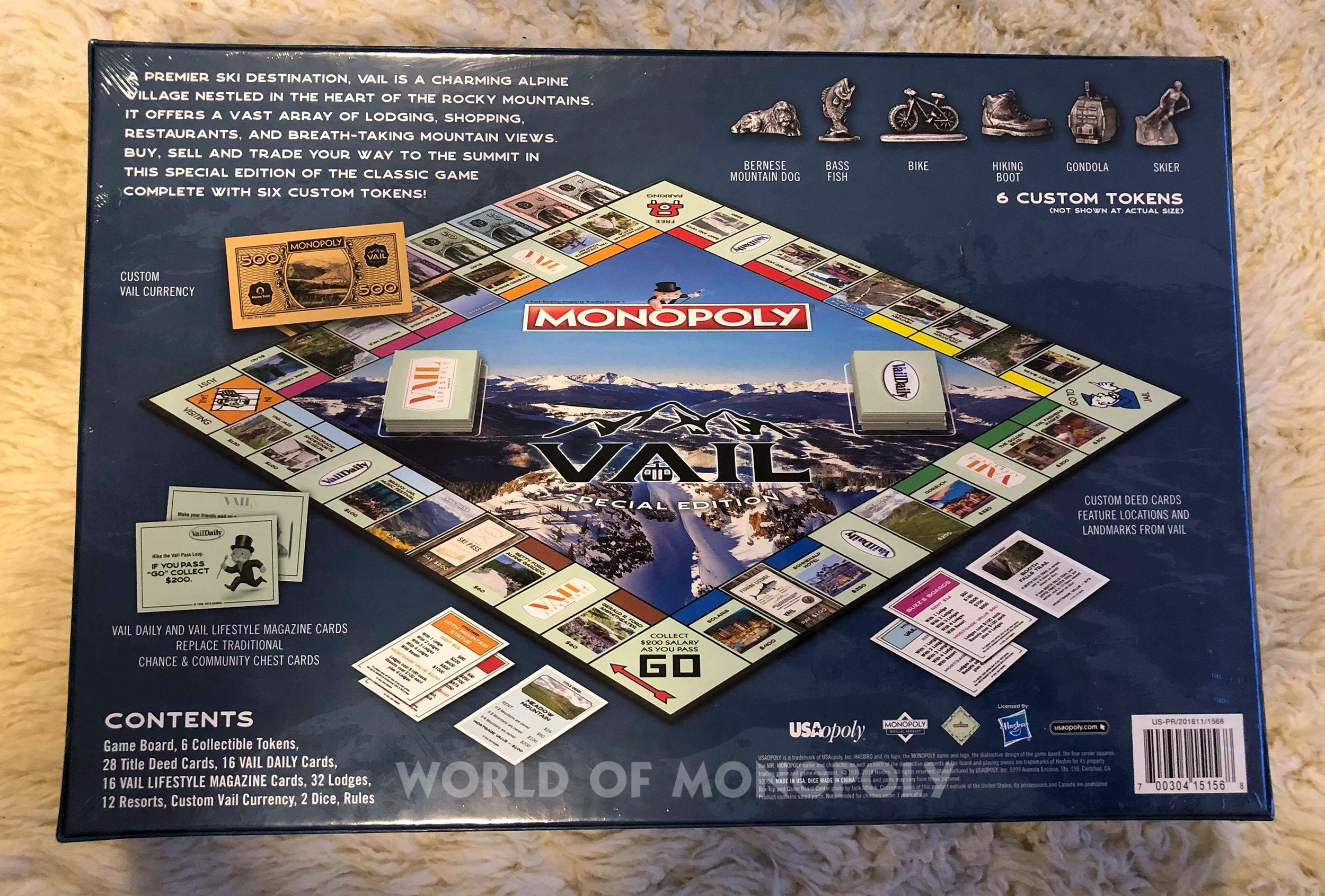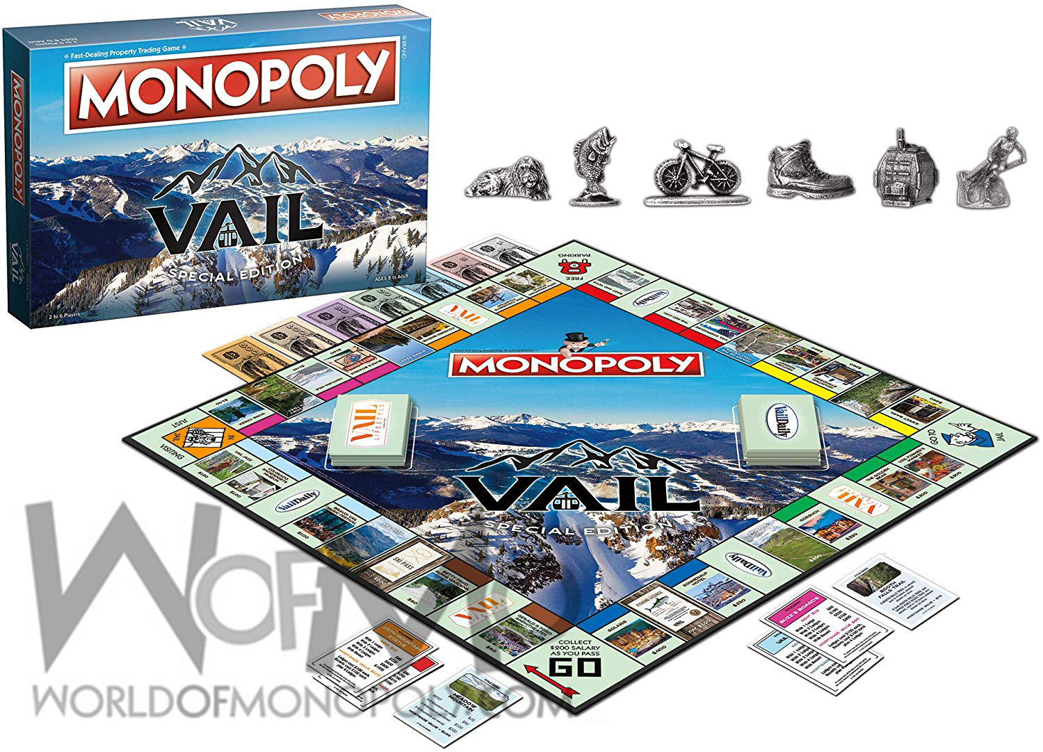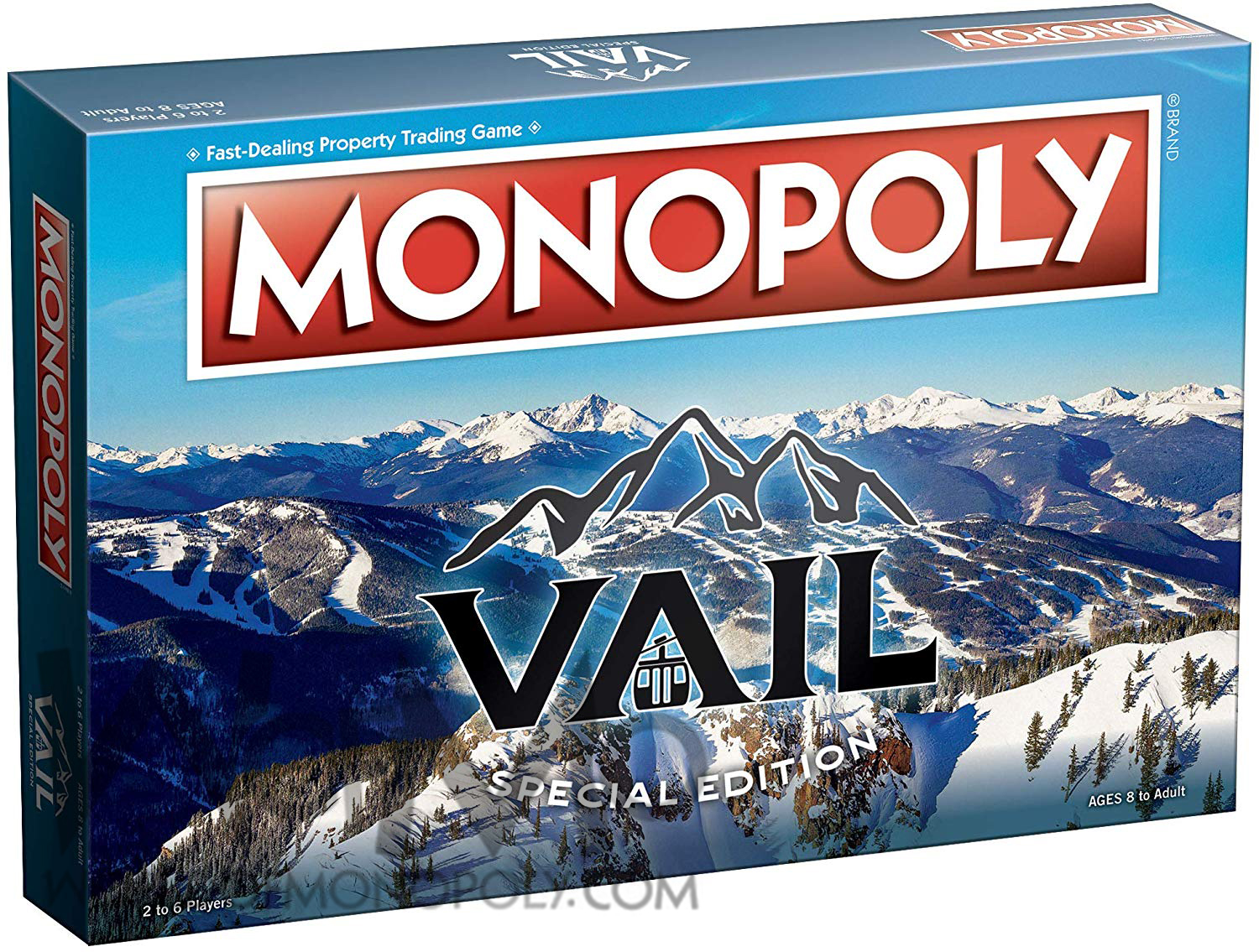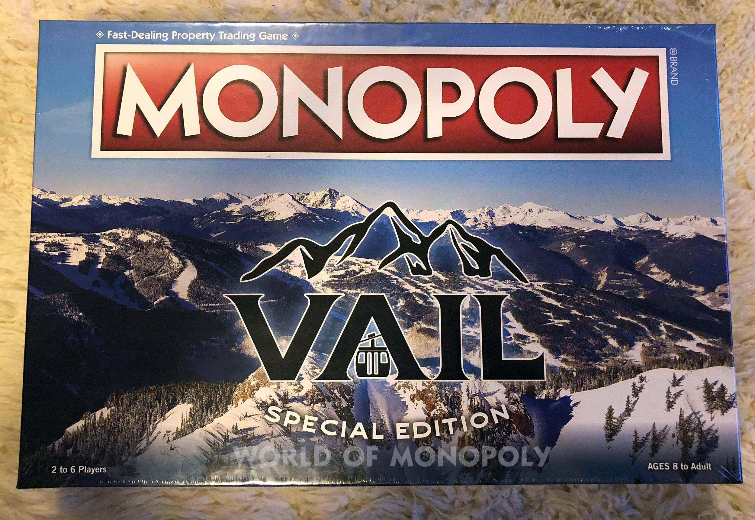 A Premier Ski Destination, Vail is a charming alpine village nestled in the heart of the Rocky Mountains. It offers a vast array of lodging, shopping, restaurants and breath-taking mountain views. Buy, Sell and Trade your way to the summit in this special edition of the classic Monopoly game. Complete with six custom tokens Embark on your trip through the charming alpine village of Vail, Colorado in this special edition of Monopoly. Travel through iconic landmarks, mountains and local shops as you buy, sell, and trade your way through the town center and beyond.