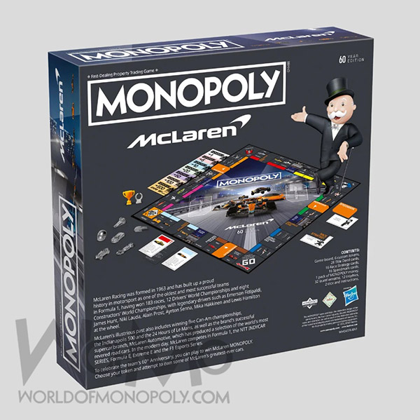The McLaren Monopoly will provide the ultimate gaming experience. Boasting official McLaren branding, this special version of the classic board game includes exclusive tokens featuring various McLaren supercars. Enjoy hours of fun with friends and family, or challenge other players online to become the ultimate McLaren Monopoly champion!