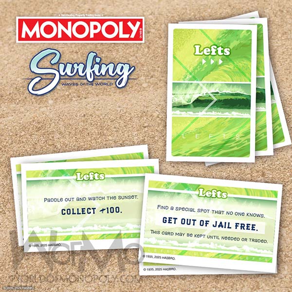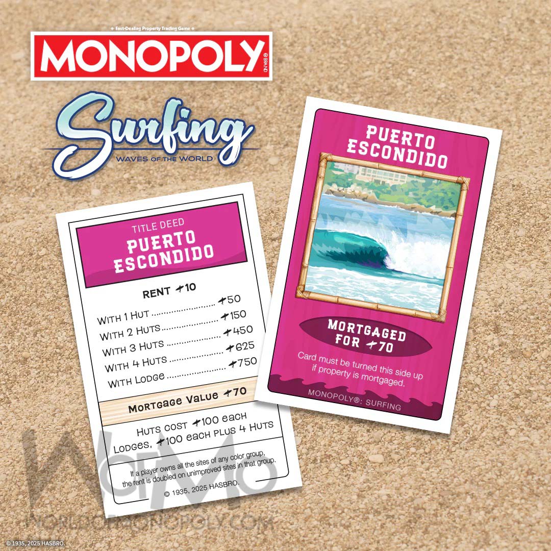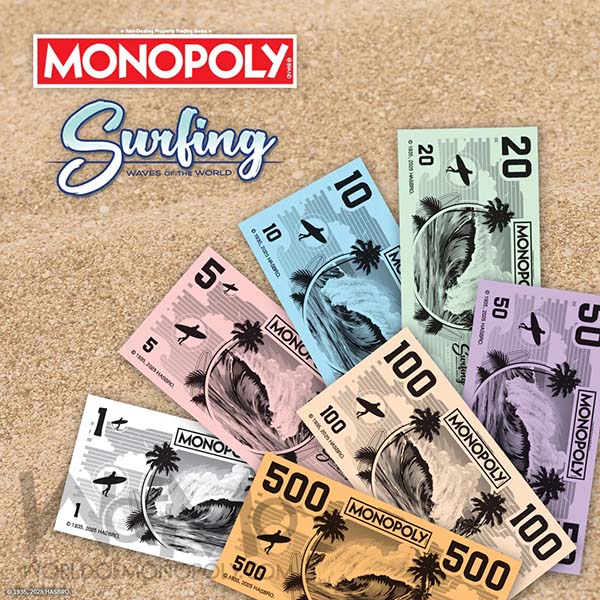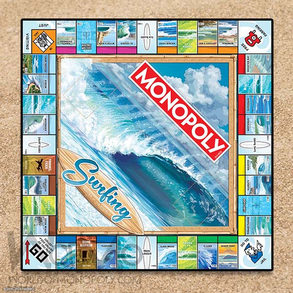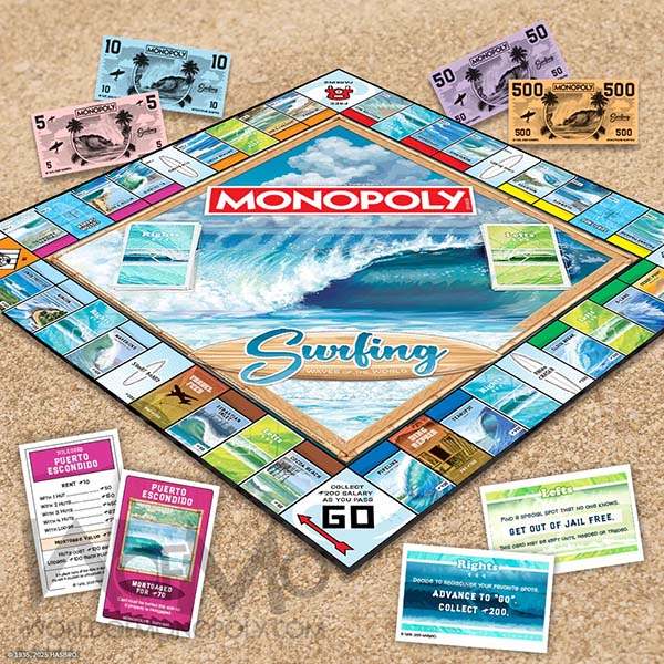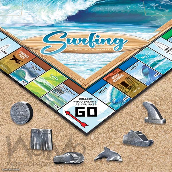 Ride the waves of fun and competition in MONOPOLY: Surfing! Buy, sell, and trade iconic surf spots like Cocoa Beach, Pipeline, and Superbank . Featuring 6 custom sculpted tokens – a surfboard fin, board shorts, a dolphin, and more! Dive into Community Chest and Chance cards that bring unexpected challenges, like catching the perfect wave or facing a gnarly wipeout. Gather your friends, and may the best surfer claim victory!